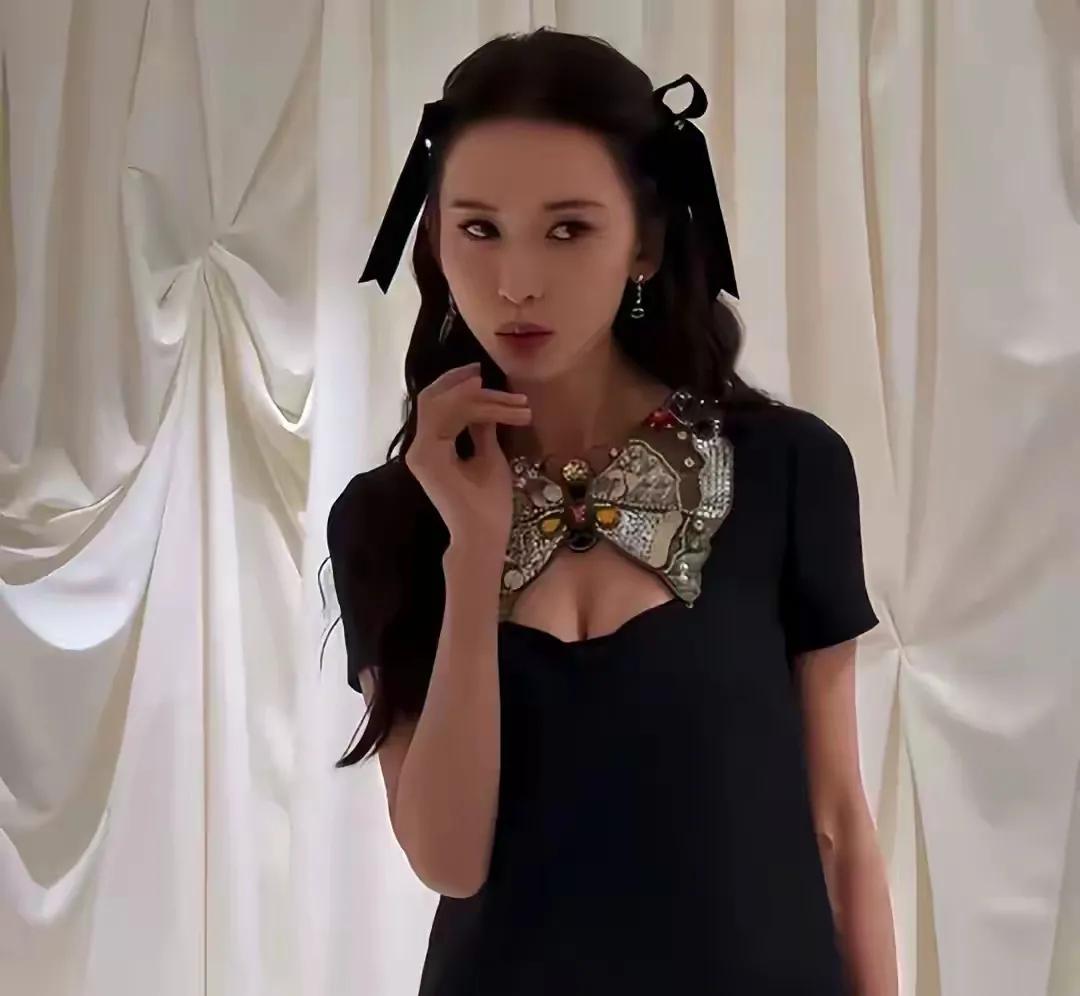 志玲姐姐不仅露出事业线,还穿了充满无尽魅惑的黑丝,与她以往的端庄大气之美,相去甚远,给人一种浓浓的风尘感,尤其是她对着镜头嘟嘴比心的时候。