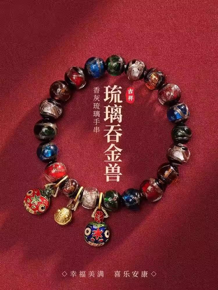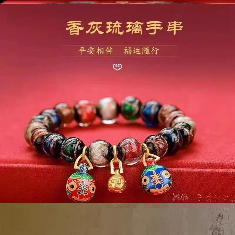 香灰琉璃手串不仅制作工艺独特,颜色背后也有着美好寓意。琉璃作为佛家七宝之一,与香灰融合后,被赋予更多象征意义 。