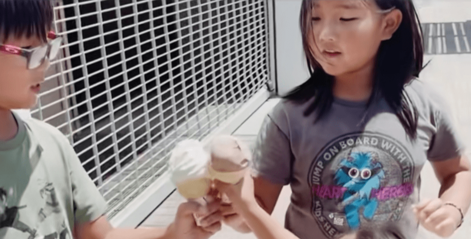 画面一转,三个萌娃便齐齐出镜。七宝和妹妹宝妹一人拿着一个冰淇淋,兄妹俩还上演了一出“冰淇淋碰杯”,仪式感很足啊,哈哈哈。而从这个视角可以看到,宝妹似乎又晒黑了不少诶,胖嘟嘟的脸蛋儿超可爱,脸型和妈妈很像哦。