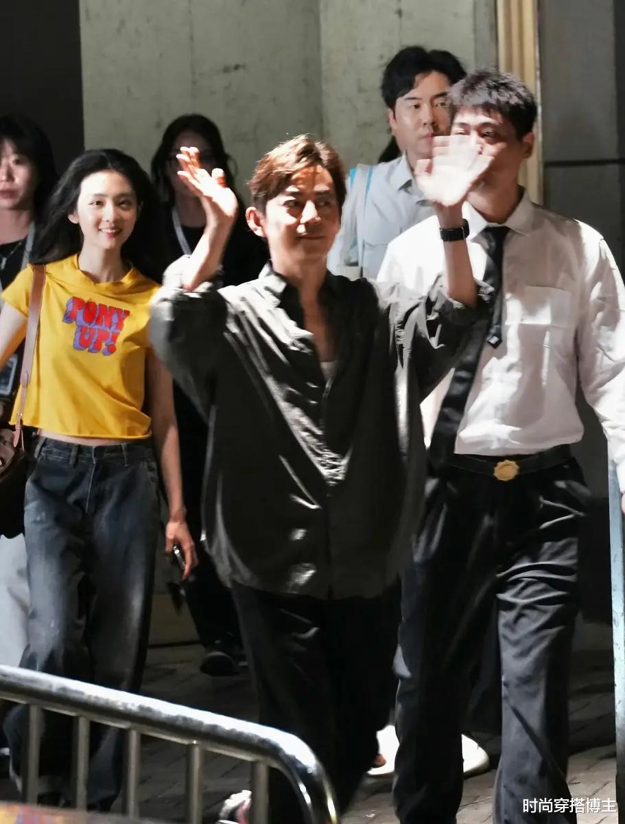 很朴素的日常穿着,一件简单的黄色T恤配牛仔裤,头发也没有任何造型,就任它随意披散着,一边走出来,一边巧笑嫣然的和粉丝们打着招呼,可就是觉得好明媚啊!