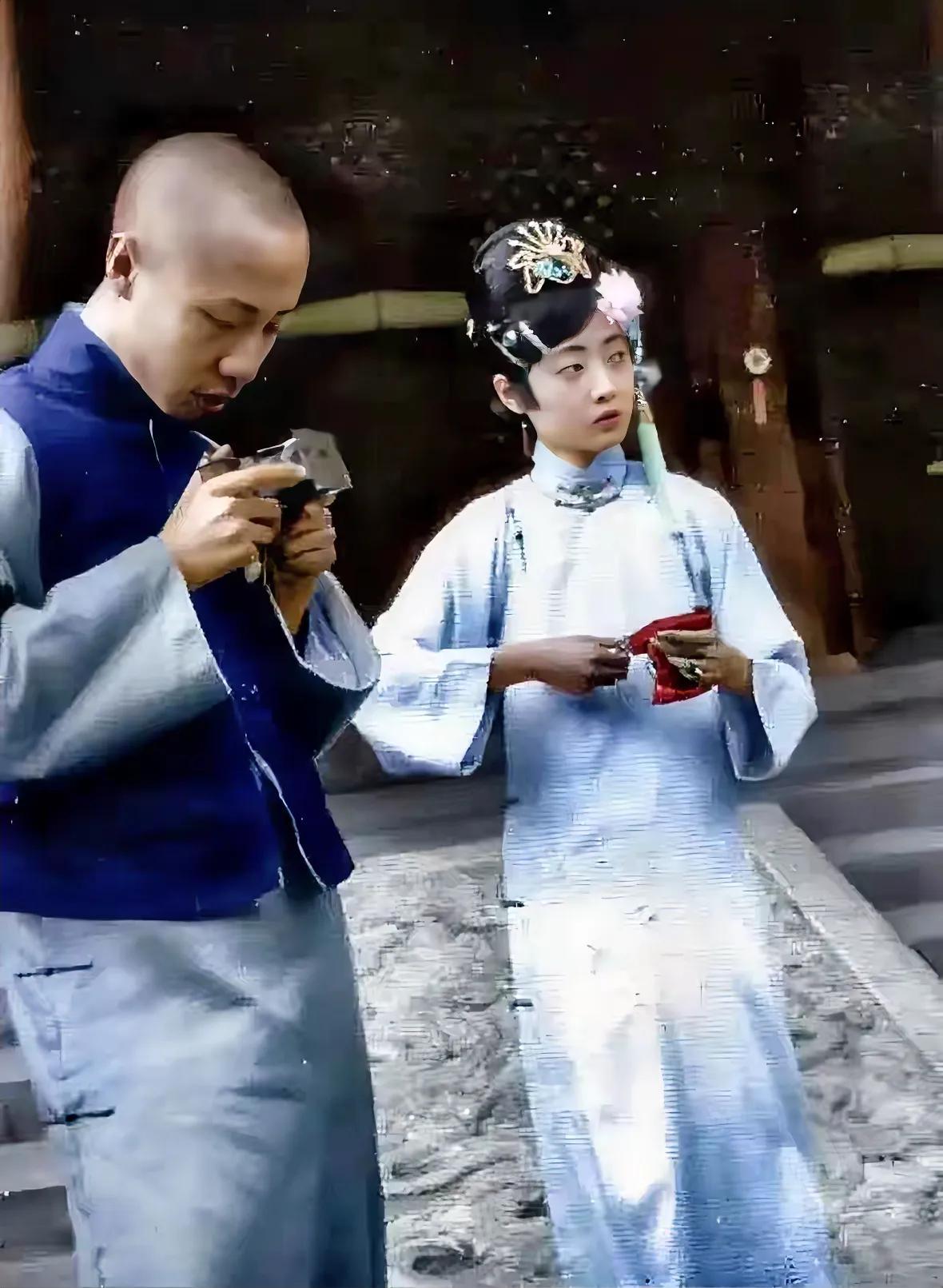 这是婉容和溥仪的真实合影,并非演员扮演,货真价实的罕见照片。溥仪认真看着手里的小物件,婉容则看向一边,两人都只是十几岁的孩子,却已经结婚,婉容绝美的容貌,无疑是清后宫最亮丽的风景线。