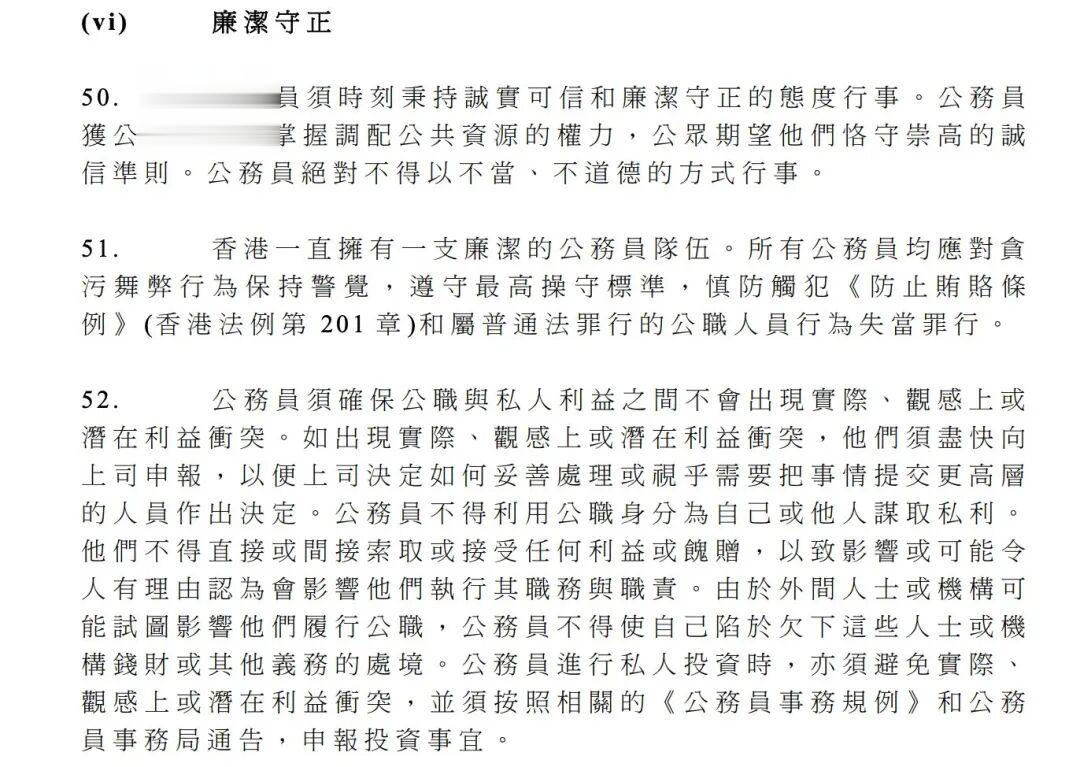 据香港《公务员守则》,“廉洁守正”为香港公务员必须遵守的操守准则之一。其中提到:“公务员须确保公职与私人利益之间不会出现实际、观感上或潜在利益冲突。如出现实际、观感上或潜在利益冲突,他们须尽快向上司申报,以便上司决定如何妥善处理或视乎需要把事情提交更高层的人员作出决定。公务员不得利用公职身份为自己或他人谋取私利。他们不得直接或间接索取或接受任何利益或馈赠,以致影响或可能令人有理由认为会影响他们执行其职务与职责。”