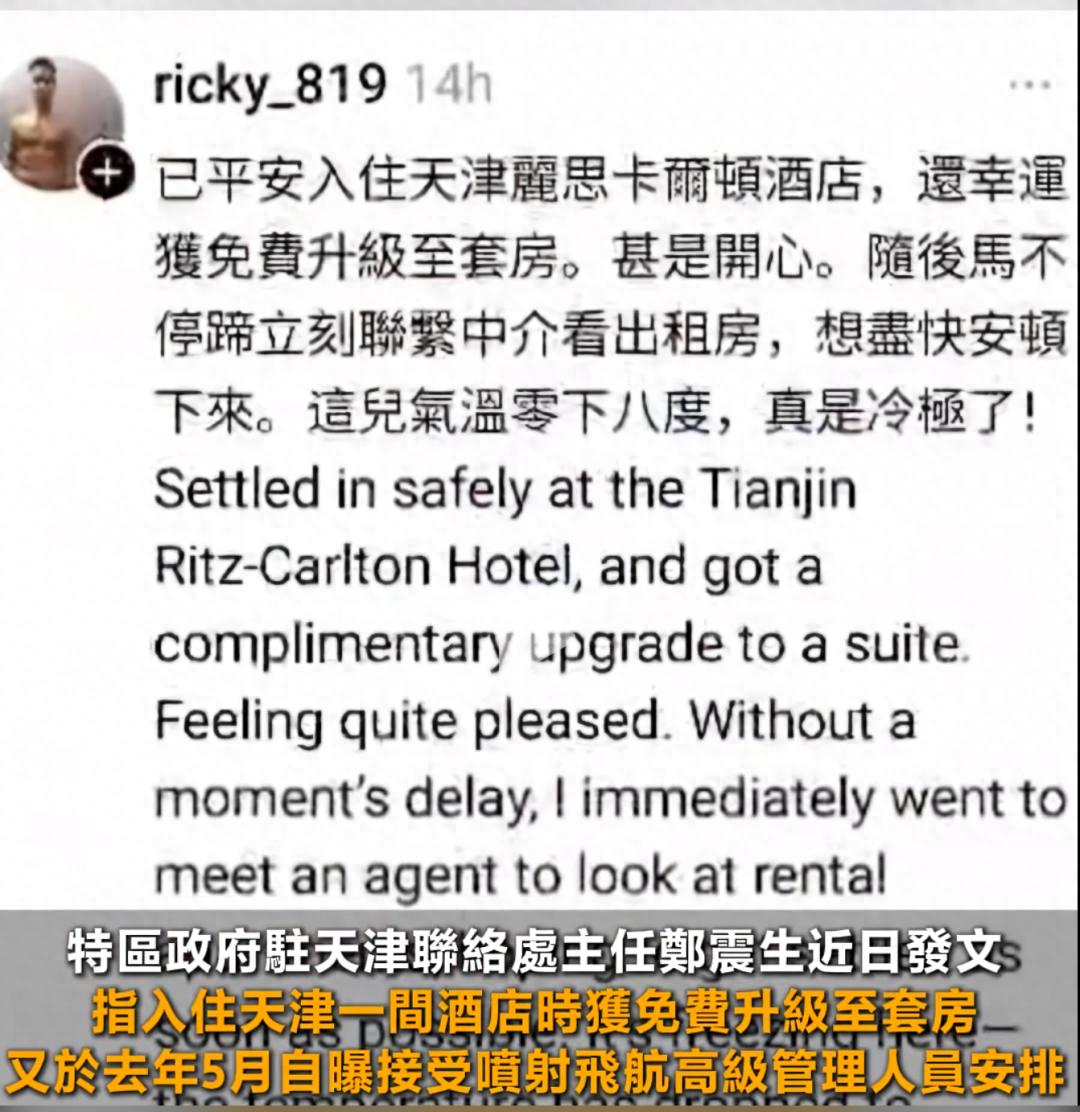 1月19日,即将出任香港特区政府驻天津联络处主任一职的郑震生在社交媒体上发布贴文,提到自己在入住天津丽思卡尔顿酒店时“幸运获免费升级至套房”,并上传套房内部视频及酒店地区总经理的欢迎信,由此引发公众对于其接受款待的质疑。