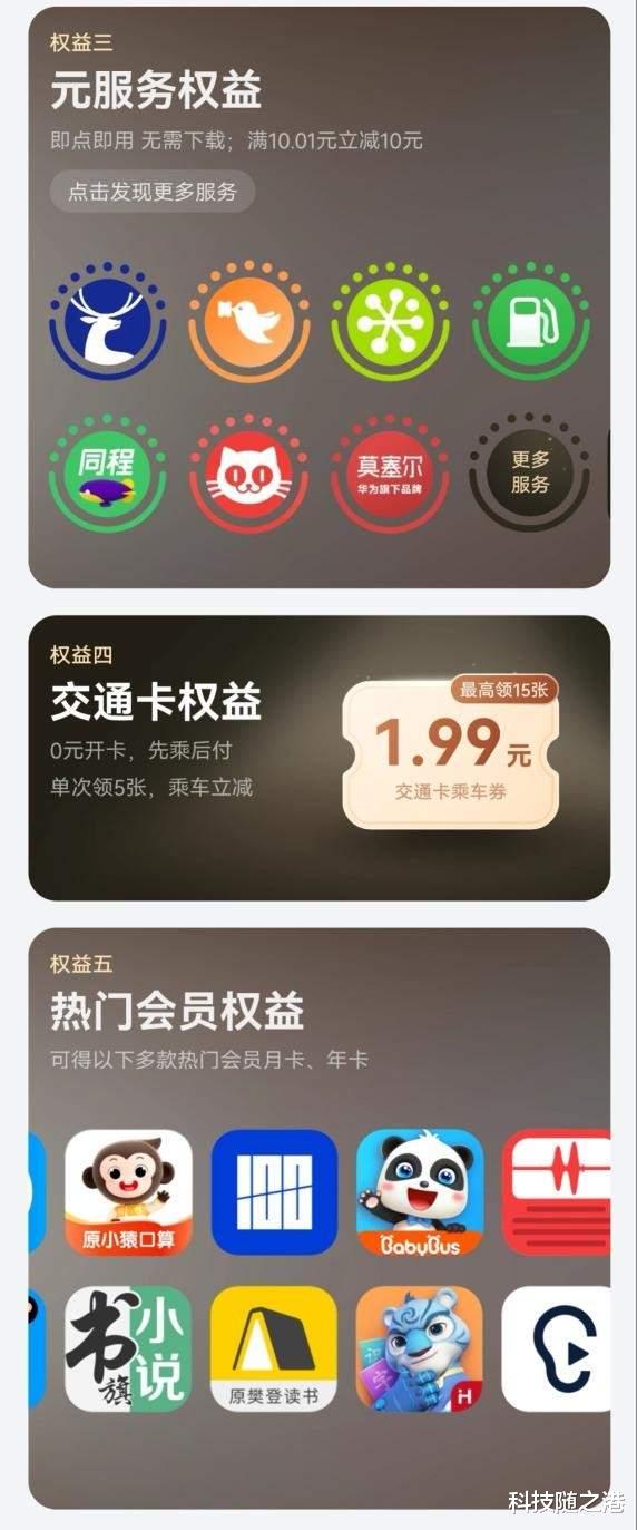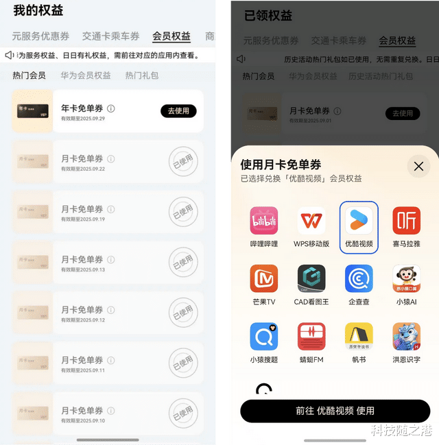 这个活动省心省力更省钱,没有多余套路,只要从桌面右滑进入负一屏,点进鸿蒙有礼入口后,每天签个到,就能领取现金红包和随机权益,福利丰富到不敢想象,包括7天免费的各种华为会员、元服务优惠券、交通卡乘车券、B站/WPS/喜马拉雅/芒果TV/优酷等APP的月卡免单券。本以为签到30天领到十张月卡免单券,让我的优酷会员续了10个月已经算是福利的巅峰了,万万没想到,华为这波“宠粉”居然还有续集!