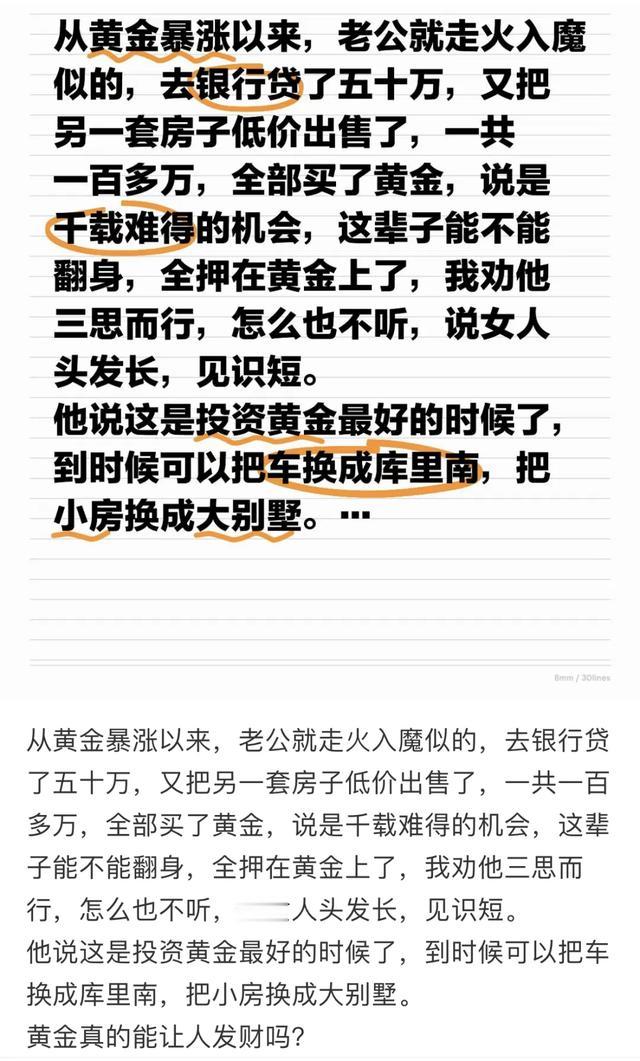 类似的还有有网友发帖称:「自黄金暴涨以来,老公就走火入魔似的,去银行贷了五十万,又把一套房子低价出手了,一共一百多万,全部买了黄金……」