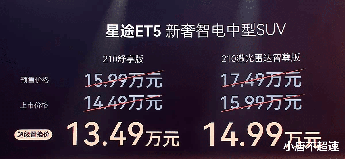 11月28日,星途汽车旗下全新中型SUV——星途ET5正式上市。新车共推出210舒享版和210激光雷达智尊版两款车型,上市指导价分别为14.49万元与15.99万元。与此同时,官方也推出了超级置换方案,置换后价格分别为13.49万元和14.99万元。