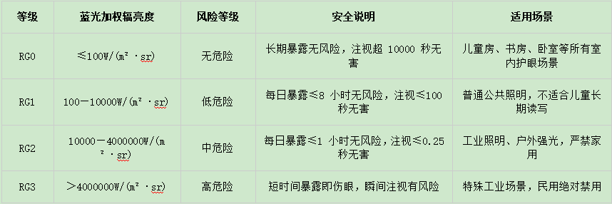在LED照明灯具领域,无论是国际上还是国内都对蓝光做了具体的规定。一般是将光源的蓝光危害等级分成4个等级。具体如下: