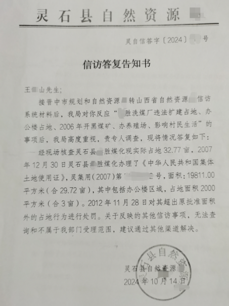 近日,山西省晋中市灵石县交口乡马家庄村民王宝山反映了自己的遭遇,当地一家某胜洗煤厂疑似存在不合理占地、程序缺失等问题,相关监管环节的漏洞,让村民的合法权益受损,维权之路步履维艰。