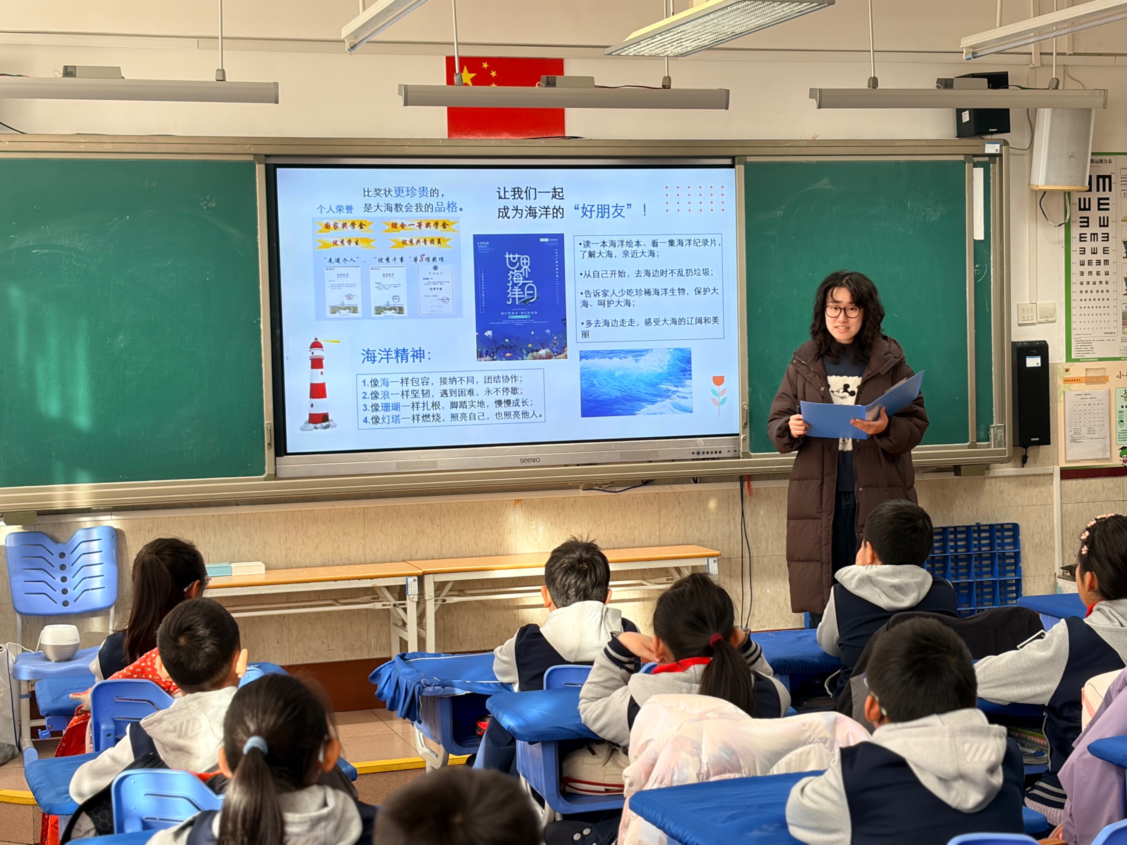 中国海洋大学2024级预备党员、团支部书记汪雨陌学姐走进实小,带来“探索蓝色家园,共筑海洋强国”主题思政课。活动伊始,“祖国有多大”的互动提问瞬间点燃全场氛围。汪雨陌围绕习近平总书记“关心海洋、认识海洋、经略海洋”的重要指示,用通俗易懂的语言解读海洋的多重价值——蓝色粮仓、能源宝库、生命摇篮、未来家园,并以新学期计划为喻,生动阐释“十四五”海洋经济发展规划与少年儿童的密切关联。她结合自身经历,分享了组织“渔你志愿行”海边垃圾清理、开展“渔见·人物志”、探究黄海渔业资源变化等实践故事,展现了新时代大学生扎根海洋、奉献青春的责任担当。汪雨陌还向队员们发出倡议,从读海洋绘本、海边不乱扔垃圾等小事做起,成为海洋的“好朋友”,让孩子们在学到海洋知识的同时,厚植了家国情怀。