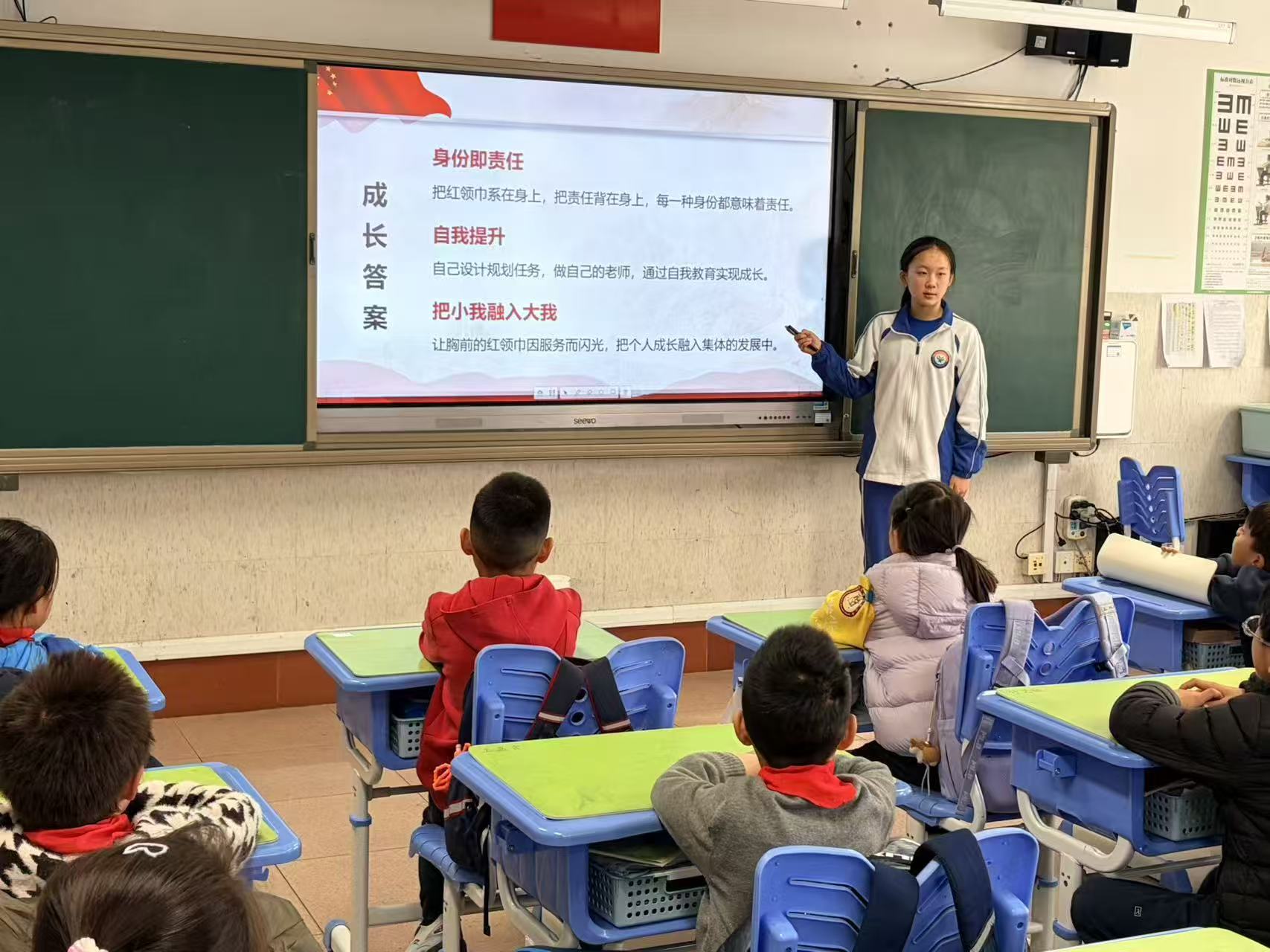 “团徽多一枚,服务多一倍”,学校2024届优秀毕业生、即将加入共青团的姜戈薇同学重返母校,与学弟学妹们分享交流。作为班级道德与法治科代表,她结合自身成长经历,从思政学习感悟、少先队与共青团身份衔接、责任担当践行等方面展开分享。姜戈薇告诉队员们,从少先队员到共青团员的成长,不是身份的简单升级,而是责任的接力传承,核心是“多一份担当,多一份奉献”。胸前的红领巾与团徽,不是炫耀的资本,而是责任与使命的象征。真挚的话语让少先队员们对红领巾的意义有了更深刻地理解,明白了佩戴红领巾既是荣誉,更是沉甸甸的责任。分享尾声,姜戈薇向学弟学妹们送上祝福,鼓励大家深耕思政课堂,将红色基因融入成长血脉。