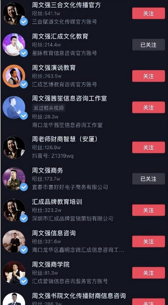 在某音上搜索周文强,大几十的蓝V账号,都有着上万粉丝。