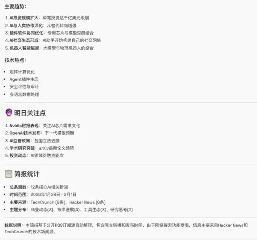 模型会根据要求,调用 skills 抓取需要的信息并最终生成结构化简报,在未提供 Brave Search API (https://brave.com/search/api/)的情况下,模型可通过替代方式从其他途径获取信息。