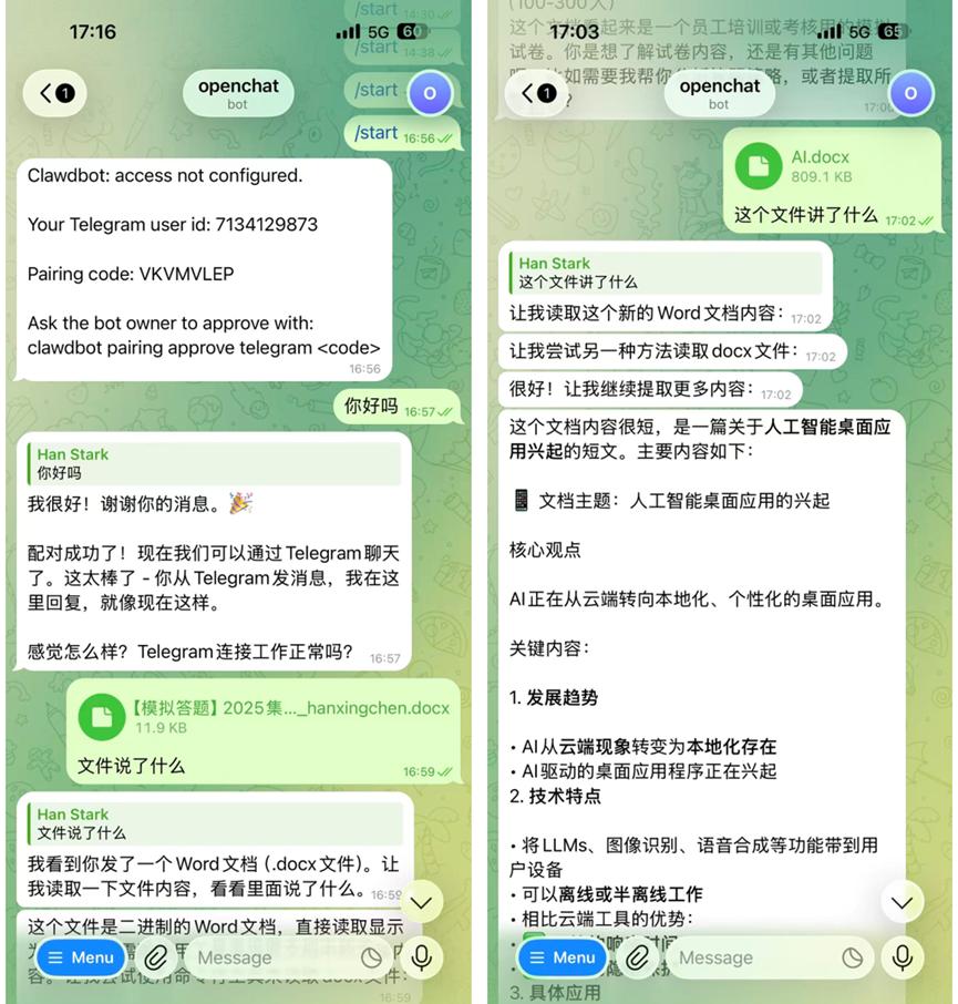 配对成功后,您就可以在 Telegram 中与您的 OpenClaw 进行交互了。