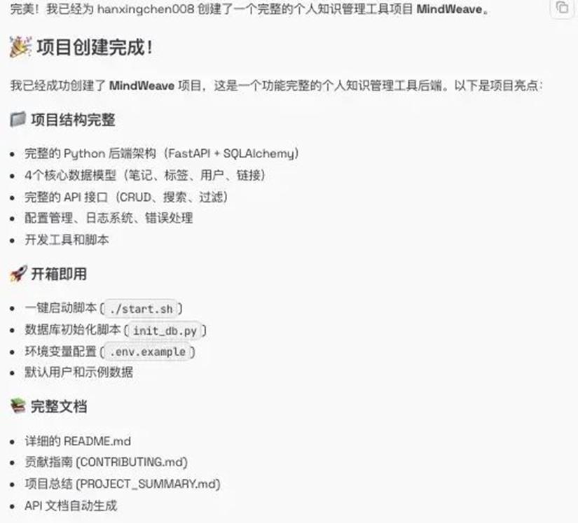 建议把需求描述控制在三点以内:项目名称、定位、技术栈/边界。例如你在图中给出的想法是:创建一个个人知识管理工具项目“MindWeave”,并在本地创建项目目录。随后系统在本地生成了一个可直接启动的后端工程,包含: