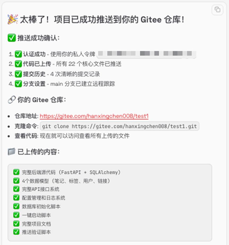 更强检索:配置 Brave Search API Key,提升网页覆盖与召回; 扩展来源:加入 arXiv、论文/博客、厂商发布页,让简报更“行业化”; 多渠道分发:支持邮件、Telegram 等二次推送; 更稳的调度:接入 cron/OpenClaw 的任务机制,统一做失败告警、日志轮转、执行耗时统计。Ø 示例 2:从想法到仓库:自动生成项目并推送到 Gitee