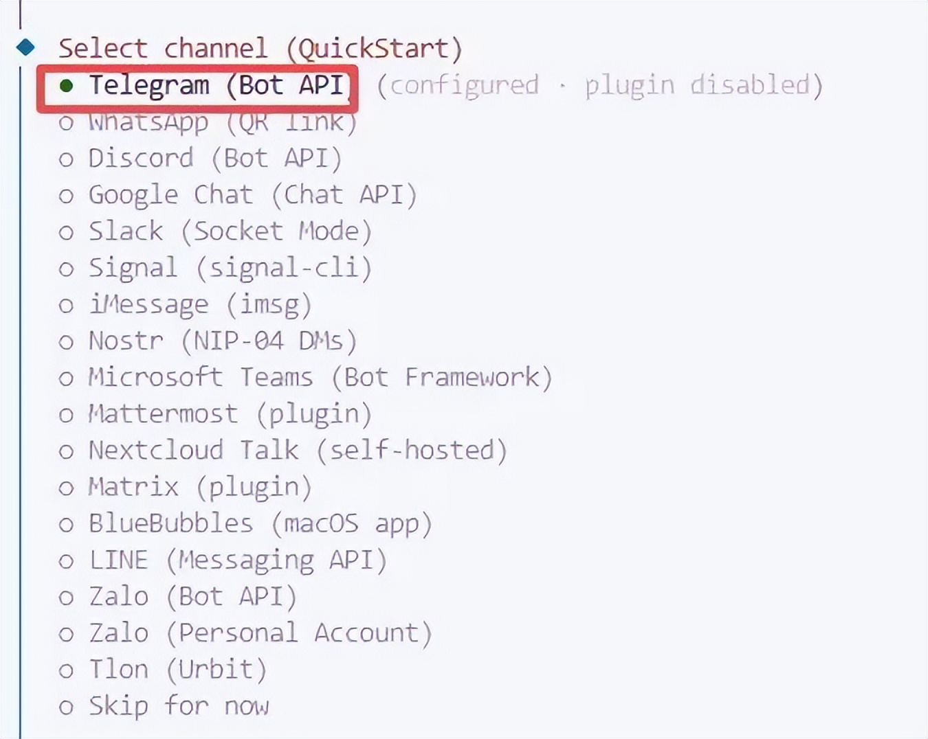接受风险提示; 选择 QuickStart 以进行快速配置; 选择模型提供商(或跳过以进行自定义配置); 选择您希望连接的消息通道(例如 Telegram)。更详细内容,请参考博客文章: