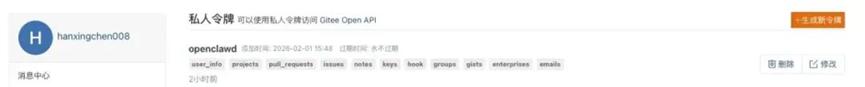 获取其账号下的个人令牌,用于OpenClaw随后访问你的仓库,可点击生成新令牌获取,并妥善保存;