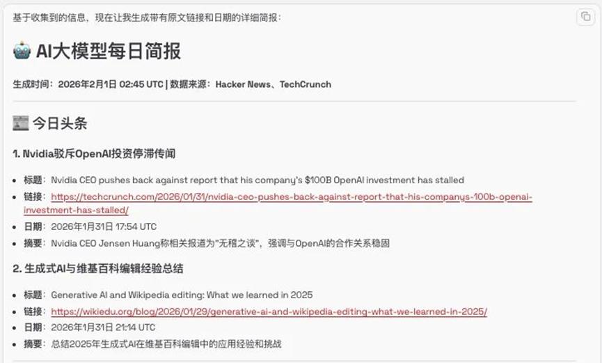 聊天框里直接说明需求即可:让它从指定来源搜集前一日 AI 大模型相关新闻,并输出结构化简报。