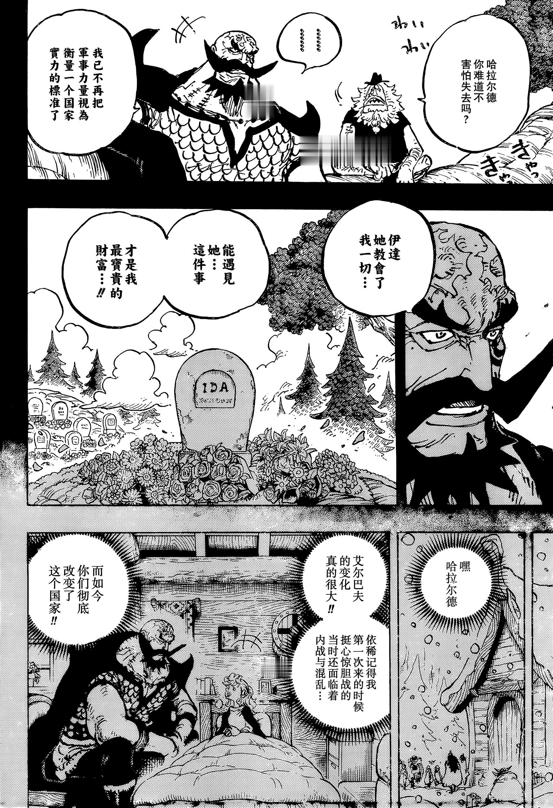 漫画最新一话的标题是我必须死,这个标题是指哈拉尔德国王必死无疑了。卷头彩页是关于洛克斯海贼团的,他们穿着西服出现。哈拉尔德国王成为神之骑士团后,他回到艾尔巴夫的城堡里,伊姆大人命令哈拉尔德国王打造一支强大的军队,哈拉尔德国王拒绝,他就被伊姆大人掌控身体。