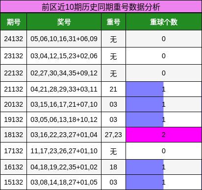 在第25132期大乐透的前区分析中,我们可以看到一些明显的趋势和模式。首先,关于重号的分析显示,近10期内的历史同期中,上期并未开出重号,而且重号出现的比例相对较低,只有60%。考虑到这种转冷的趋势,我们预计本期重号可能会继续轮空,因此可以排除掉上期的中奖号码作为选择。