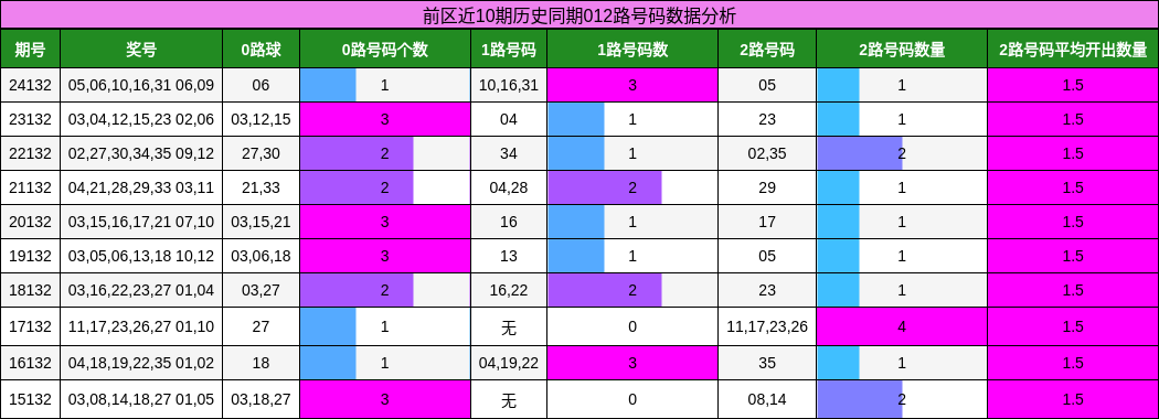 在前区0路号码的分析中,我们可以看到近10期内历史同期平均每期出现2.1个0路号码,比理论值多出一些。这表明0路号码近期表现活跃,特别是在上一个历史同期中开出了1个0路号。因此,我们建议关注0路号码的热出,精选胆码推荐为03, 12, 30和33。