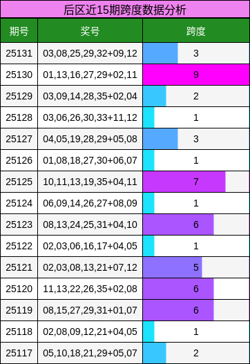在后区的跨度分析中,上期的跨度值为3,跨度走势整体波动较小。根据历史数据,我们预计本期的跨度值将在1到11之间。由于上期跨度相较于上上期下降了6点,我们可以关注跨度值的上升趋势。