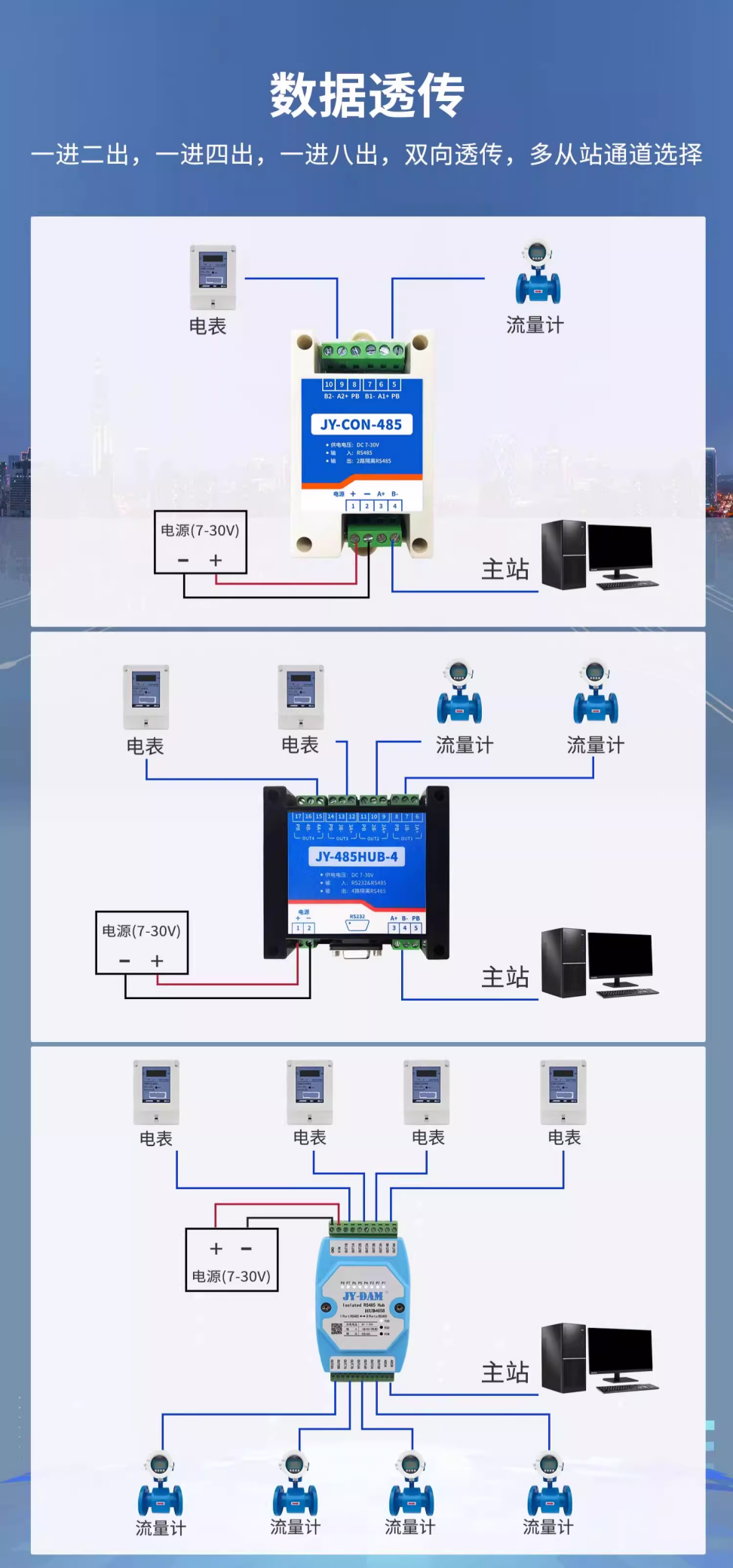 一进二出,一进四出,一进八出,双向透传,多从站通道选择。无需区分设备品牌与通信协议,只要设备具备标准RS-232接口(如电脑COM口、PLC编程口)或RS-485接口(如传感器、变频器、门禁控制器),均可直接连接,常见适配场景包括:电脑与RS-485传感器组网、PLC与RS-232触摸屏通信、工业组态软件与RS-485总线设备数据采集等。