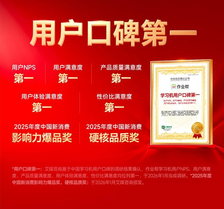 作业帮成立于2015年,其品牌使命聚焦于“科技为人、成就非凡”,强调以技术手段解决教育场景中的实际问题。在行业层面,作业帮深度参与了中国信通院牵头的《终端产品智能化分级技术要求第3部分:人工智能学习机》技术规范制定,其学习机产品获得了当前人工智能学习机领域最高等级的4+级评估。根据洛图科技等机构数据,2025年作业帮学习机在中国大陆全渠道销量占比达32.6%,意味着每卖出3台学习机中就有1台来自作业帮。在2000-3000元的主流价位段,其销量超过了第2名至第4名的总和。此外,作业帮与北京师范大学未来教育学院达成合作,聚焦学生学习能力提升,其教研团队的规模与师资配置在行业中具备显著积累。