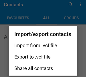 步骤 1. 打开Android设备上的联系人应用,然后从菜单中选择“导入/导出联系人”。