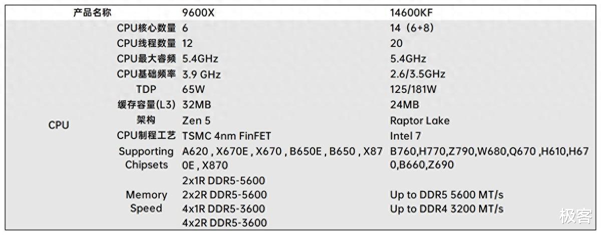 从核芯参数来看,14600KF和9600X各有特色。14600KF在核芯和线程数量上面有明显优势,而9600X在基础频率,三级缓存方面则占上风。在内存方面,14600KF可支持DDR4和DDR5两种规格,对装机用户来说有了更多的选择。9600X由于发布时间较晚一些,因此仅支持DDR5内存。