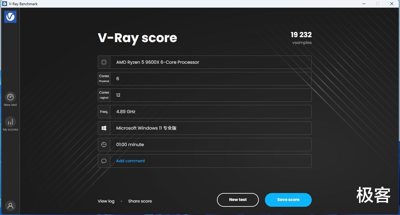 随后使用V-Ray Benchmark继续生产力测试,这是一款独立渲染速度测试软件,主要用于测试计算机的渲染速度,我这里主要测试的是CPU的V-Ray。14600KF得分为23462分,9600X的得分为19232分,14600KF要领先21%左右。