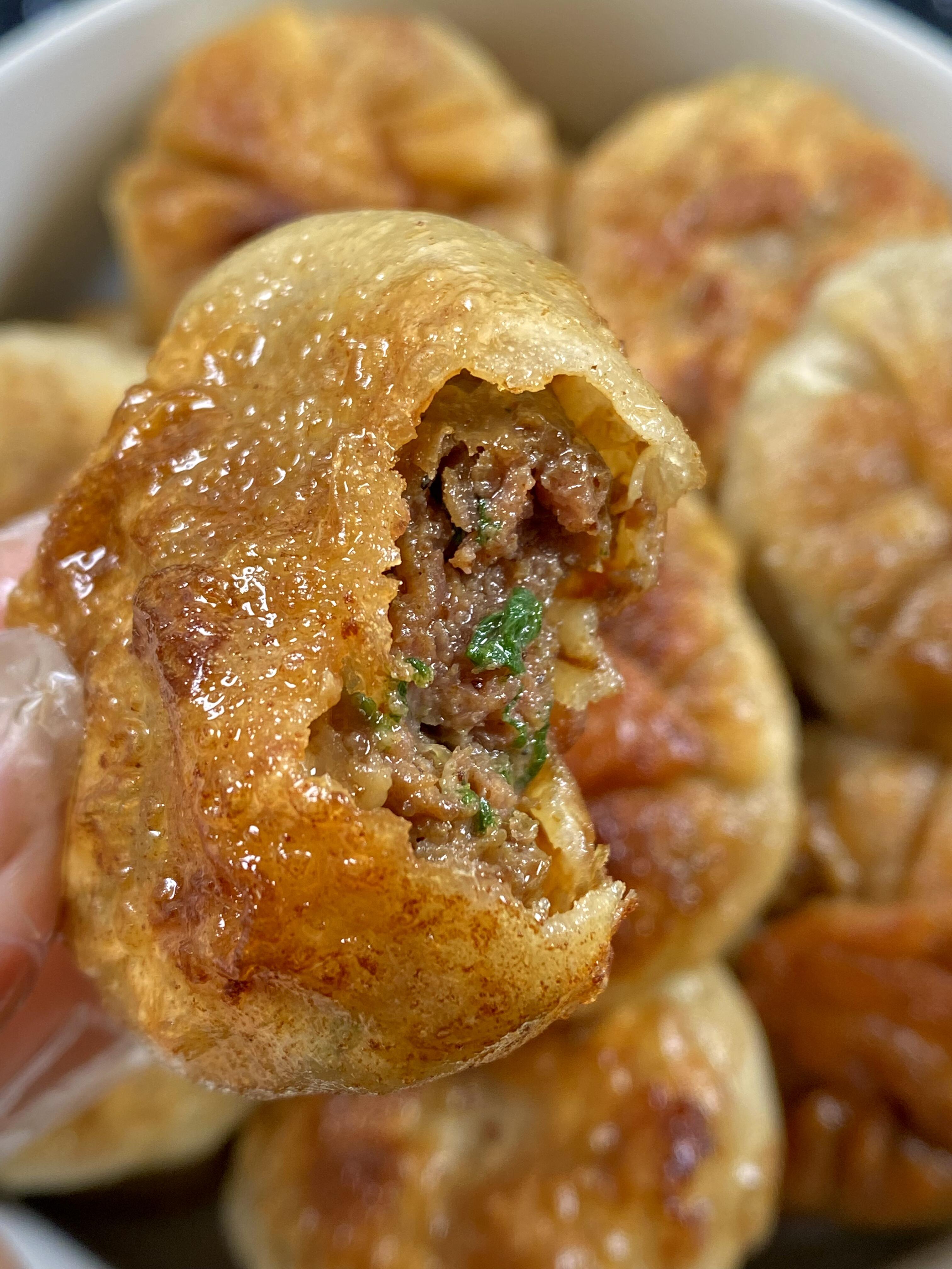 挖一勺肉馅放在面皮中间,像包包子一样捏起来,收口朝下轻轻按扁。不用追求完美,就算包得丑一点,煎出来也是金灿灿香喷喷的!我刚开始学的时候,包得像个歪瓜裂枣,但家人照样吃得津津有味,还夸我有创意呢!