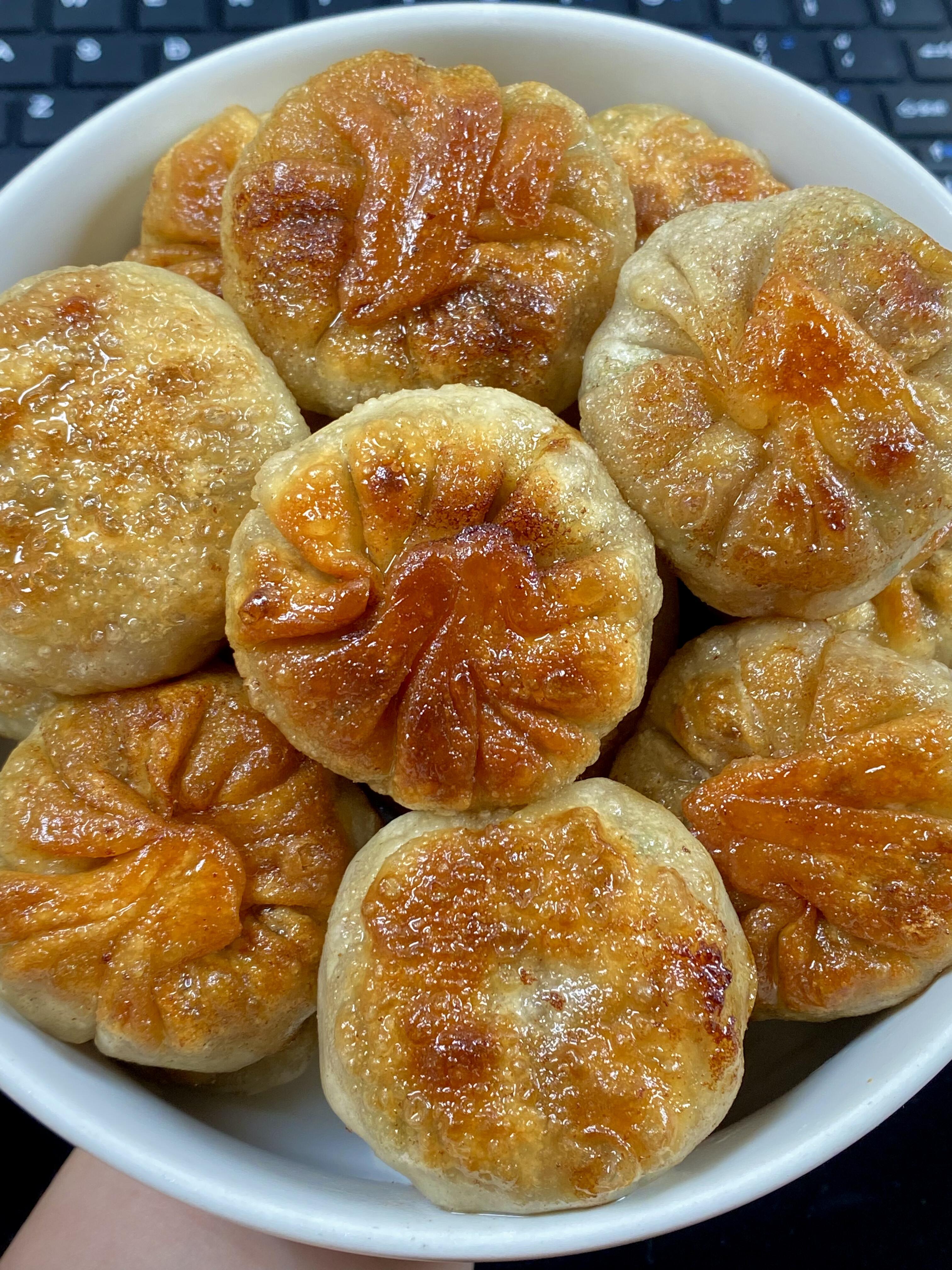 平底锅烧热,倒一层薄油,把包好的小馅饼一个个摆进去,中间要留点空隙。中小火慢煎,先煎底部,等到底面变成诱人的金黄色,再翻面继续煎。