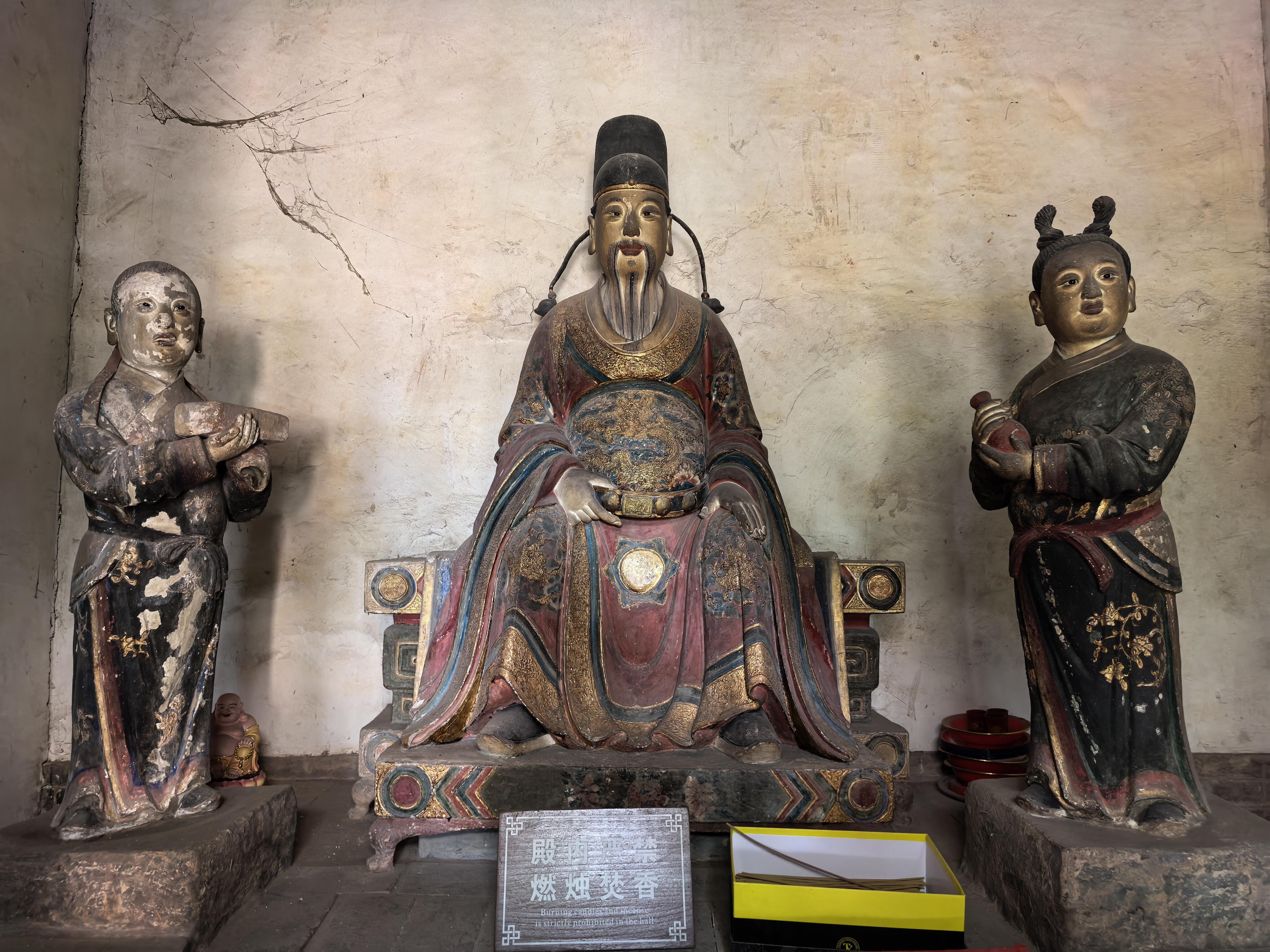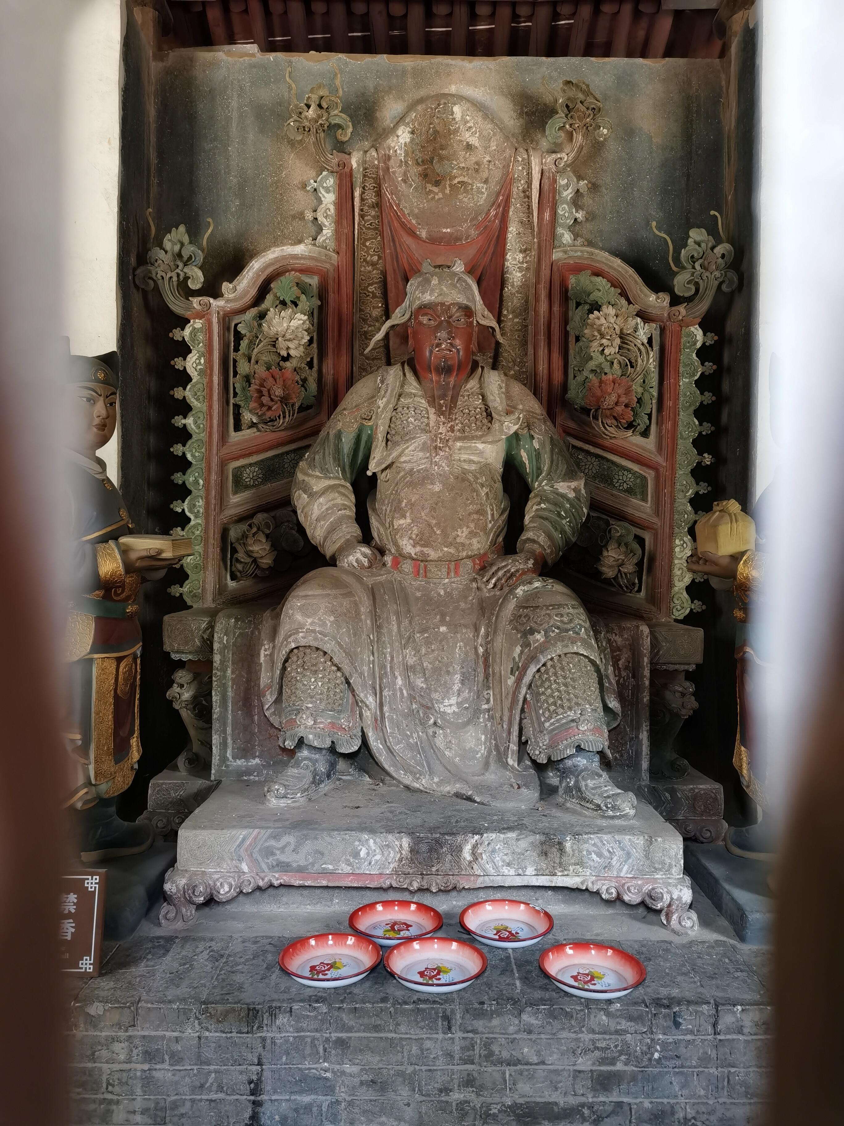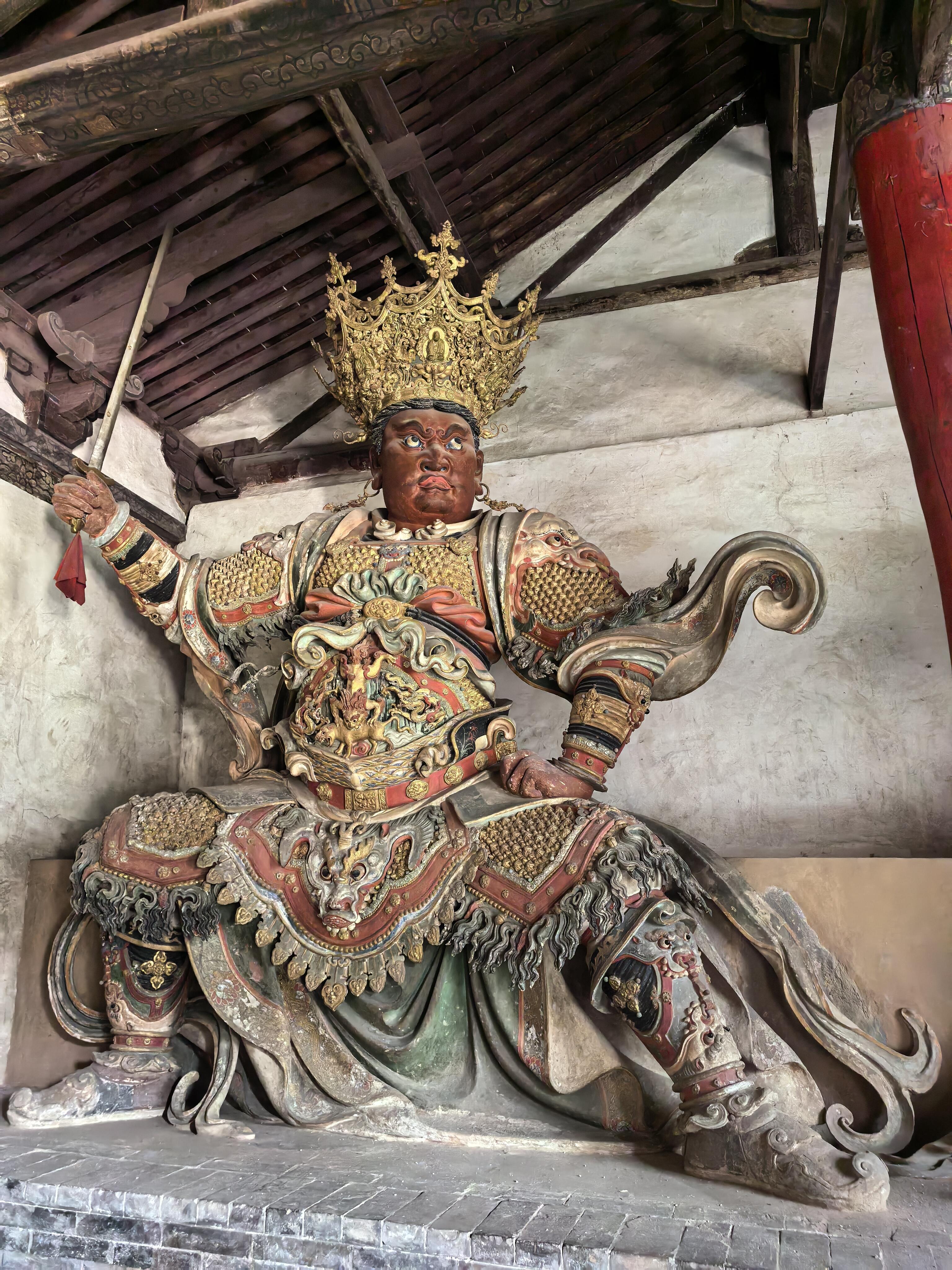 而寺内那六十余尊元、明、清三代的彩塑,更是这座古寺的灵魂所在。除了令人惊艳的四大天王,其他彩塑也各具特色。罗汉们的神态各异,有的盘腿而坐,神情专注,似在参透佛法;有的手持法器,神态安详,仿佛在守护着佛法的真谛。关帝殿中的关羽塑像,威风凛凛,红脸长髯,尽显忠义之气,让人不禁联想到他那义薄云天的传奇故事。大佛殿中的佛像,面容慈善,眼神温和,仿佛能包容世间万物,给人以心灵的抚慰。