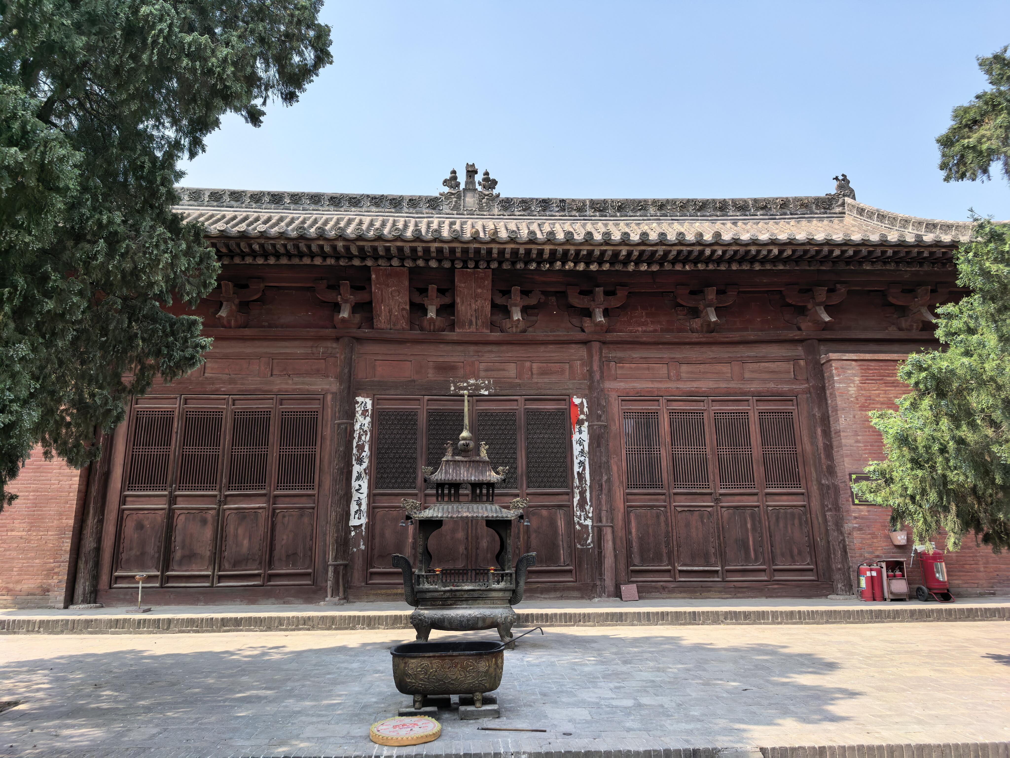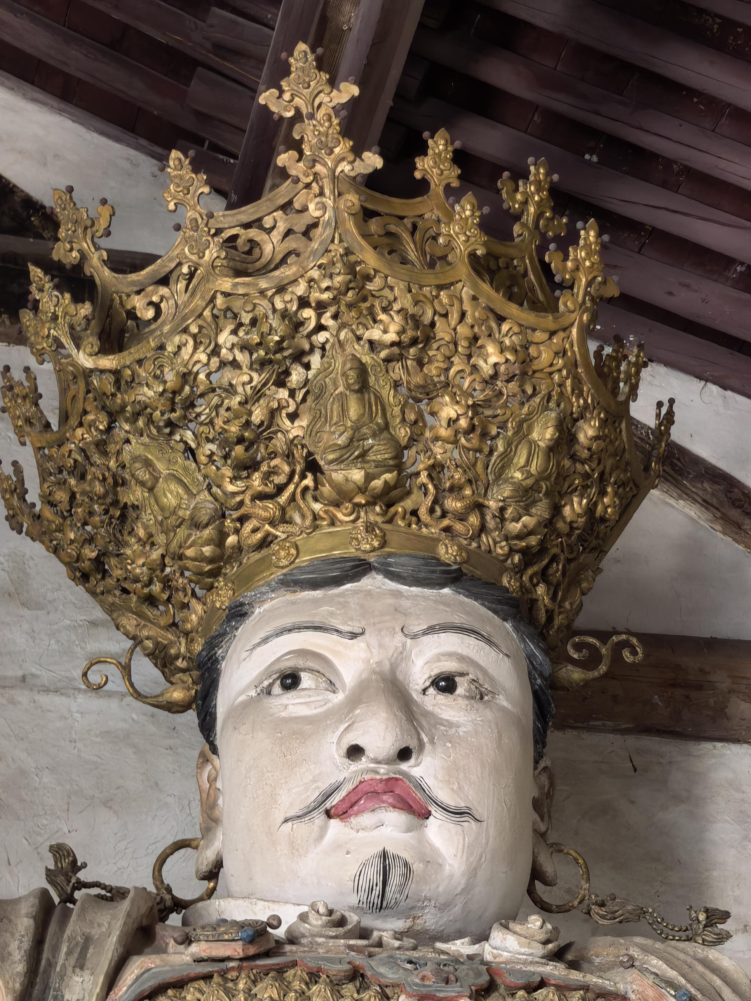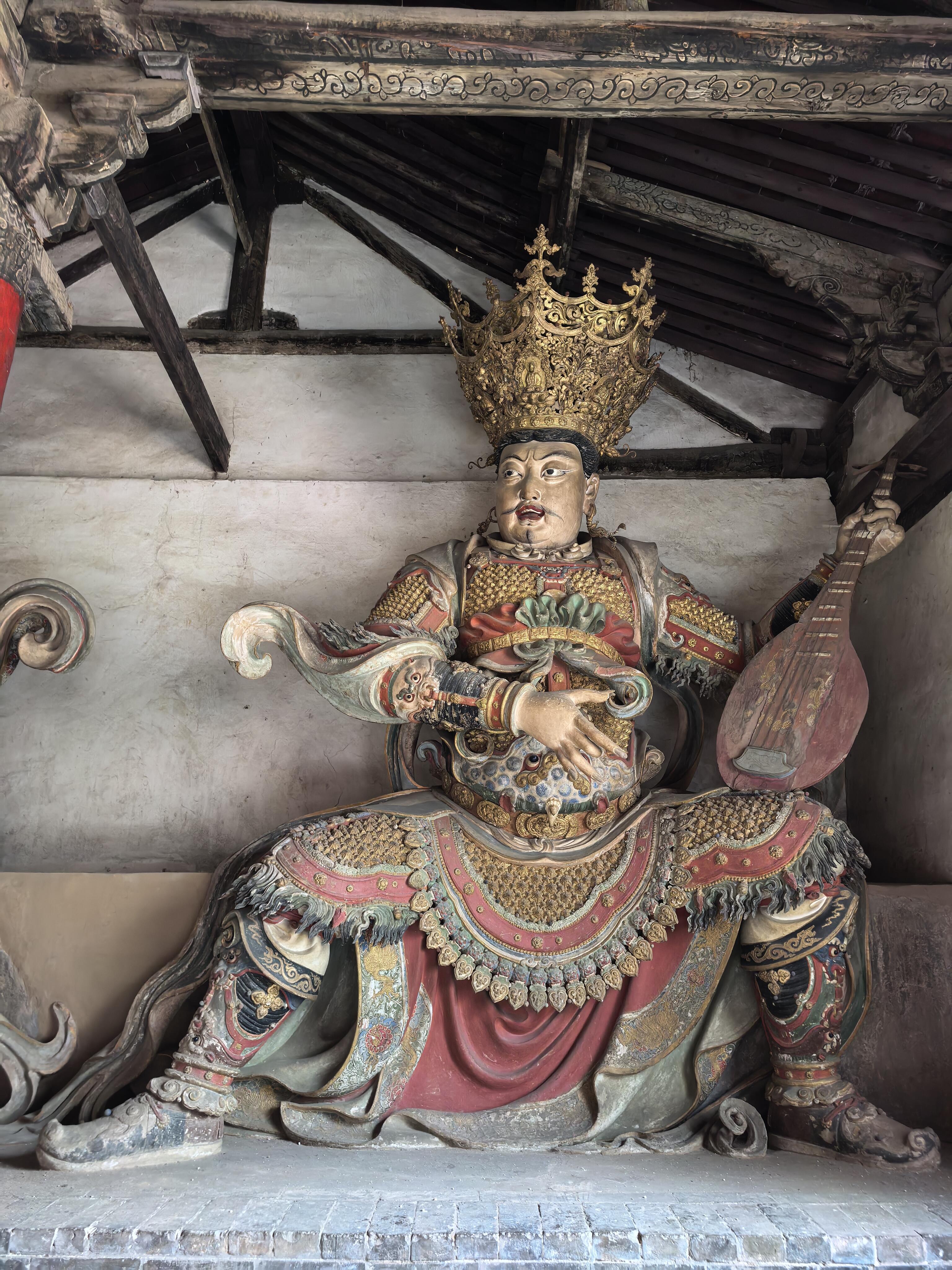 而寺内那六十余尊元、明、清三代的彩塑,更是这座古寺的灵魂所在。除了令人惊艳的四大天王,其他彩塑也各具特色。罗汉们的神态各异,有的盘腿而坐,神情专注,似在参透佛法;有的手持法器,神态安详,仿佛在守护着佛法的真谛。关帝殿中的关羽塑像,威风凛凛,红脸长髯,尽显忠义之气,让人不禁联想到他那义薄云天的传奇故事。大佛殿中的佛像,面容慈善,眼神温和,仿佛能包容世间万物,给人以心灵的抚慰。