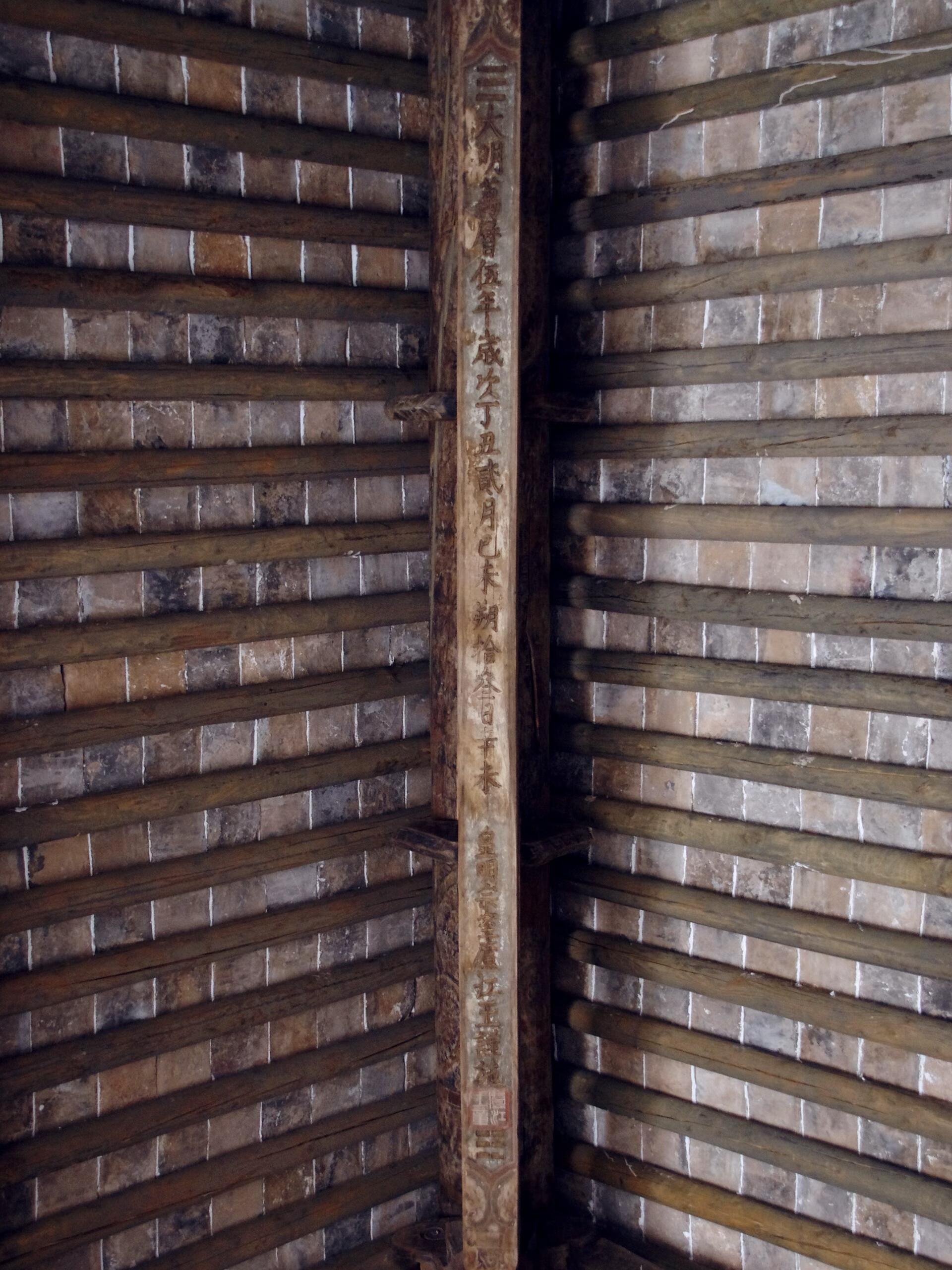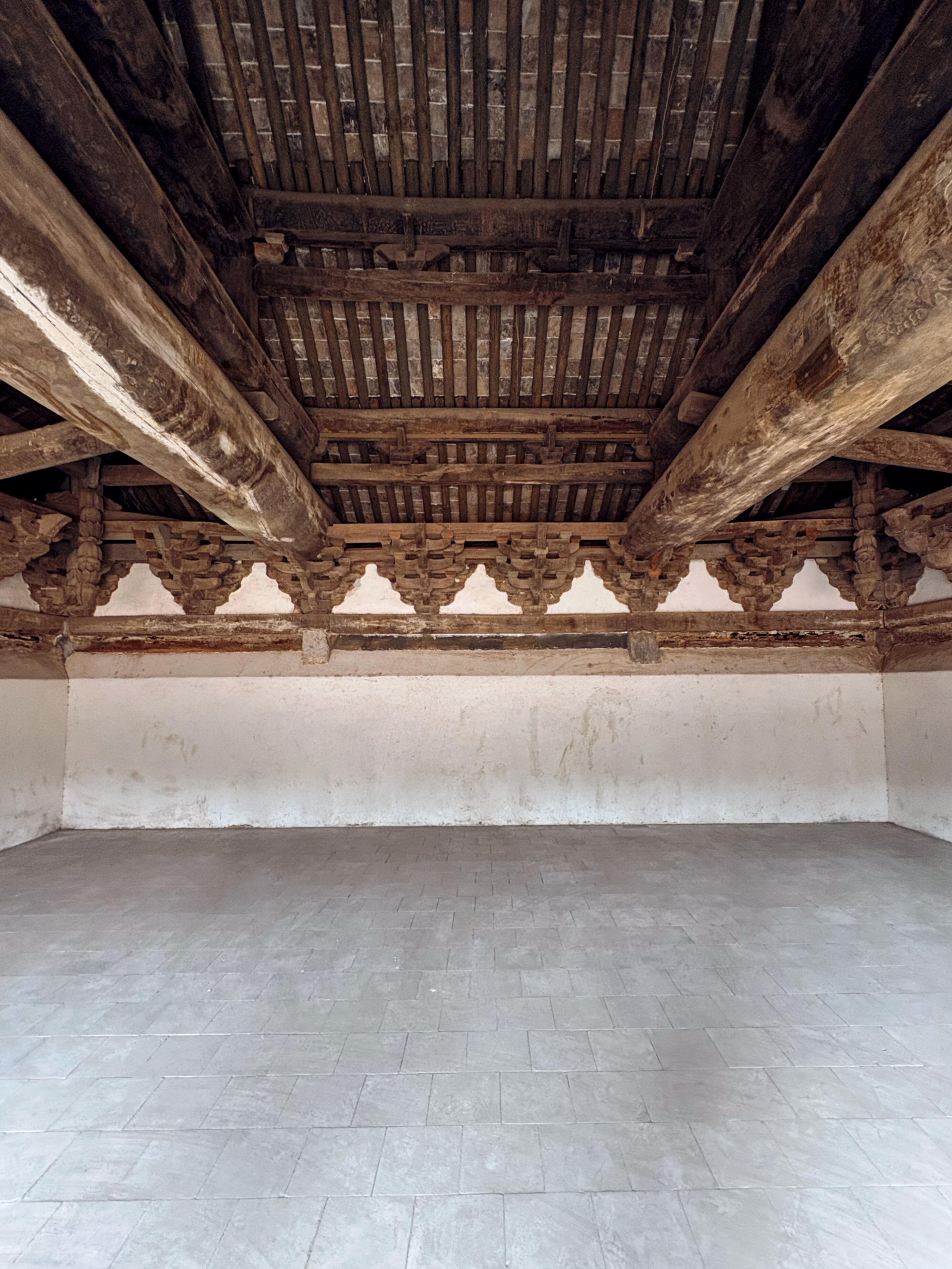 抬头看梁架上的彩画,才知道什么叫“岁月留色”。虽然有些地方的颜料已经微微剥落,但剩下的色彩依旧鲜艳:梁头的缠枝莲用石青打底,花瓣是朱砂红,花芯又点了一点鎏金,远看像花瓣在发光;檩子上的云纹用淡粉晕染,边缘又描了一圈墨色,近看能发现,墨色的线条里还藏着极小的花纹,是画工用细笔一点一点勾出来的,没有一处敷衍。最让人惊喜的是靠近柱子的梁架,上面画着几株竹子,竹叶的颜色从深绿到浅绿,再到接近黄色的嫩绿,过渡得没有一点痕迹,像是刚从院子里移栽进来,还带着露水的潮气——几百年的时光,好像没在这些彩画上留下太多痕迹,只是让颜色变得更温润,像陈酒一样,越品越有味道。