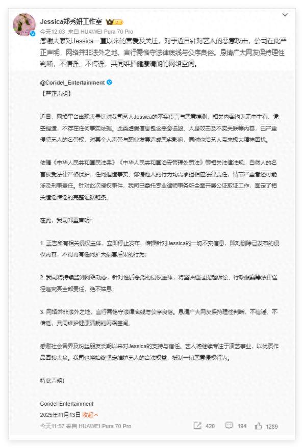 13日中午,郑秀妍工作室的官方微博发文回应称:感谢大家对Jessica一直以来的喜爱及关注,对于近日针对艺人的恶意攻击,公司在此严正声明,网络并非法外之地,言行需恪守法律底线与公序良俗。恳请广大网友保持理性判断,不信谣、不传谣,共同维护健康清朗的网络空间。