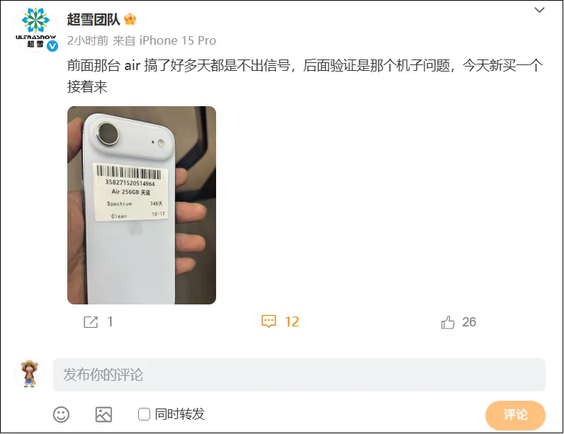 当然也有一些小插曲,在几天的时间内,都无法完成iPhone Air的解锁,其实不是软件的问题,而是机器问题,超雪也是立即购买全新的一台iPhone Air。
