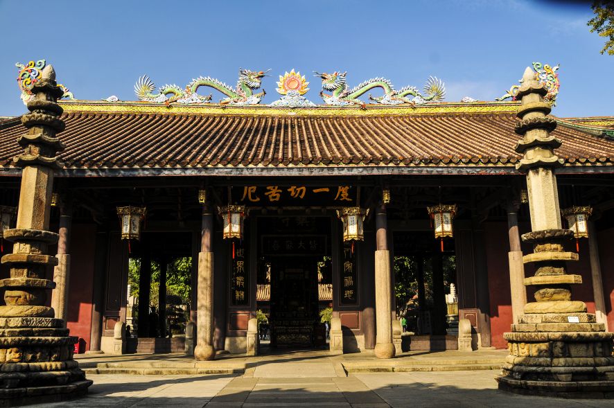 始建于唐开元二十六年(738),皇家敕建,粤东第一古刹,素有“百万人家福地,三千世界丛林”之称;寺内有宋代石经幢、千佛塔,大雄宝殿木雕精美,藏经楼藏《乾隆大藏经》;免费开放(部分殿堂另设香火券),开放7:00–17:00,红墙黄瓦适合拍古风,建议清晨或午后避开团队高峰。