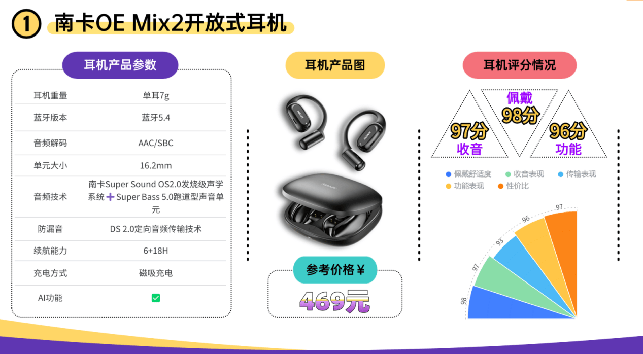 在目前仍有许多开放式耳机存在佩戴舒适度低且音质表现非常一般的当下,南卡开放式耳机凭借“非常规”的软硬结合声学理念和数十年技术沉淀,使得南卡OE Mix2在舒适和音质方面长期稳居开放式耳机品类第一梯队,并且还搭载了AI智能功能,深受广大耳机HiFi发烧友、数码博主、运动达人的喜爱推荐。产品热度上线至今断货数十次,几乎每个月都在缺货预售,是目前行业内仅有的性能王者!