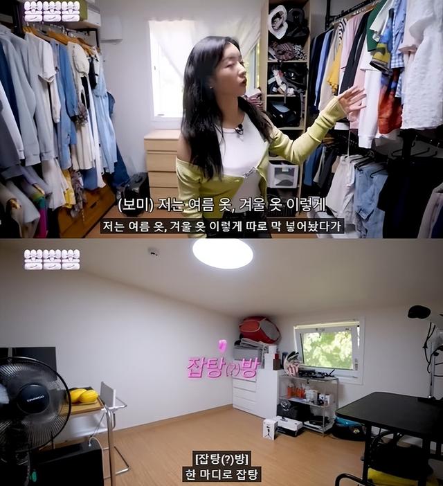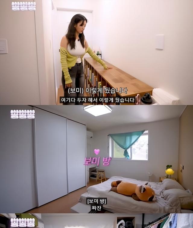 随后,尹普美透露了二楼的卧室和更衣室。走廊里有一个书架,上面放着尹普美正在看的书,尹普美的房间因梳妆台和狗衣柜而引人注目。
