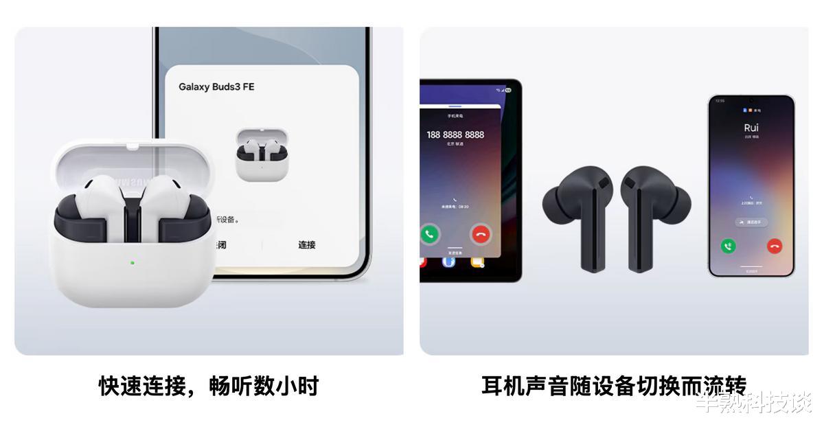 此外,“自动切换”功能彰显了三星Galaxy生态的智能化。例如,当用户正在使用平板观看视频时,若手机接到电话,耳机音频会自动无缝切换至手机;通话结束后,又会立刻切回平板的视频声音,整个过程无需手动操作,智能且高效。