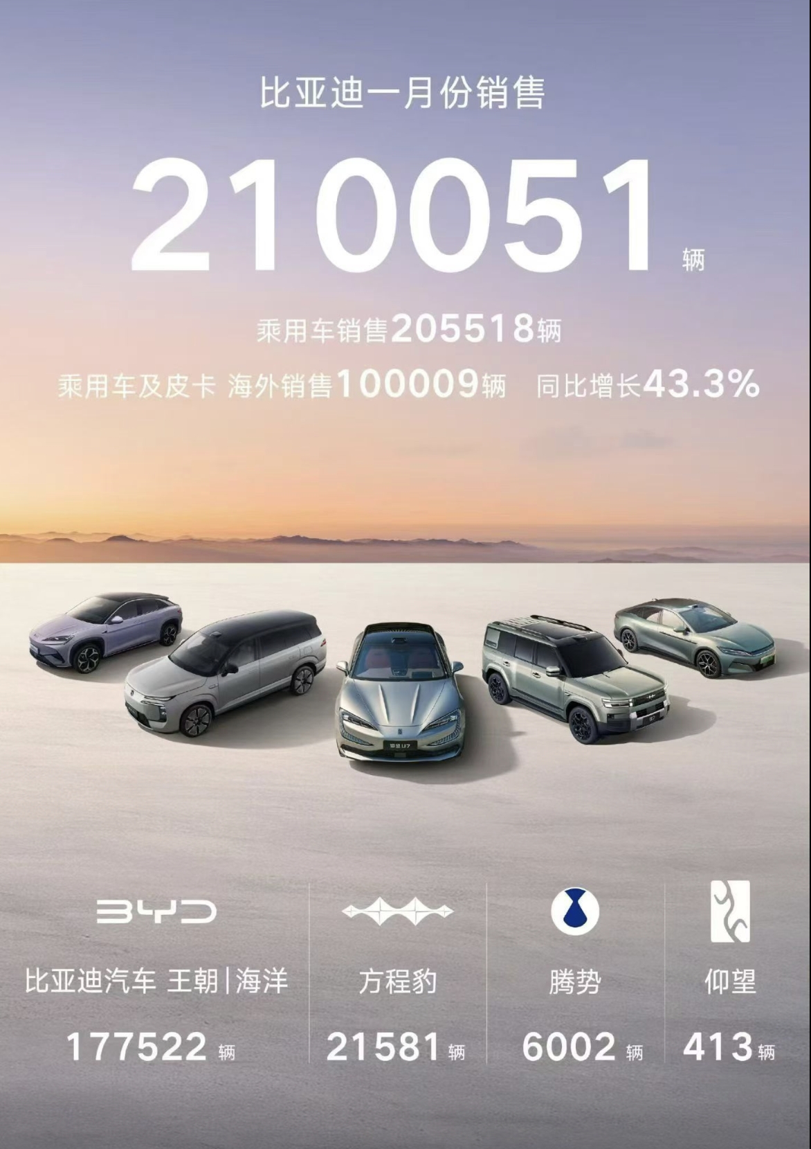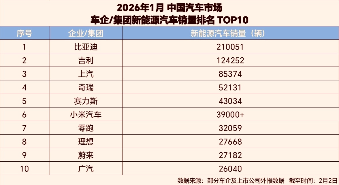2026年新春伊始,中国新能源汽车市场格局再定,比亚迪以绝对实力开启新程!1月销量数据重磅揭晓,比亚迪新能源汽车销量达210051辆,超出行业第二名近70%,稳坐新能源汽车销冠,用硬核成绩印证行业龙头地位。