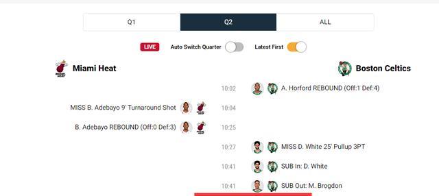 凯尔特人第13次三分出手终于命中,霍福德弧顶三分空心入网,布朗三分也有。但热火马上连中3记三分还击,继续保持两位数分差,把凯尔特人推向悬崖边缘。上半场结束,凯尔特人41-52落后。