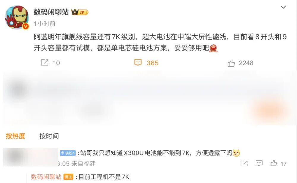 与此同时,结合同一位博主的互动回复来看,将在接下来到来的超大杯旗舰vivo X300 Ultra配备的似乎并不是7000mAh级别的电池。