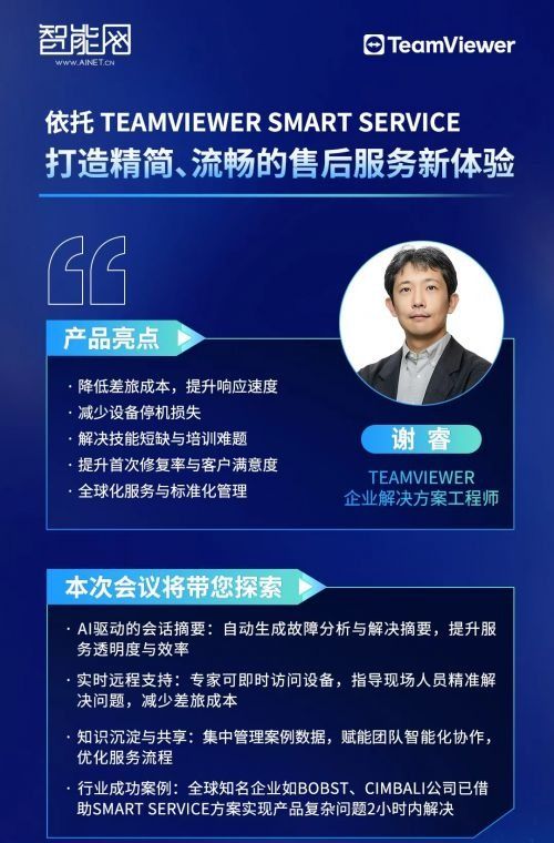 作为一款安全、高效、创新的远程售后服务智能解决方案, TeamViewer Smart Service借助安全、高效的远程连接技术,助力企业迅速诊断并解决设备故障,最大程度减少停机时间,显著提升客户满意度。无论您身处制造业、零售业,还是技术支持团队,该方案都能助您构建更高效、安全的数字化售后服务体系,而这也正是本次会议的核心探讨方向。