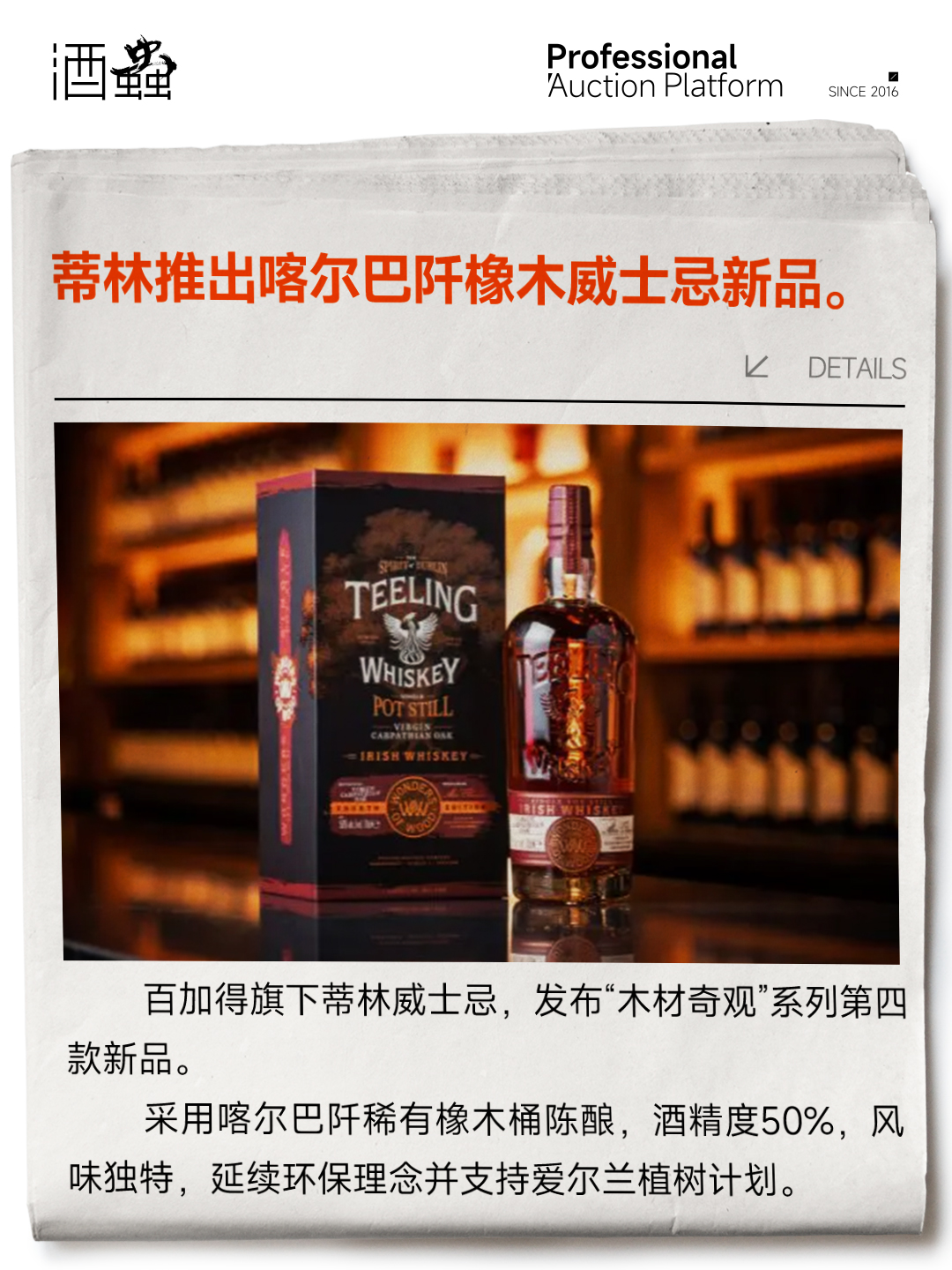 百加得旗下蒂林威士忌,发布“木材奇观”系列第四款新品,采用喀尔巴阡稀有橡木桶陈酿,酒精度50%,风味独特,延续环保理念并支持爱尔兰植树计划。