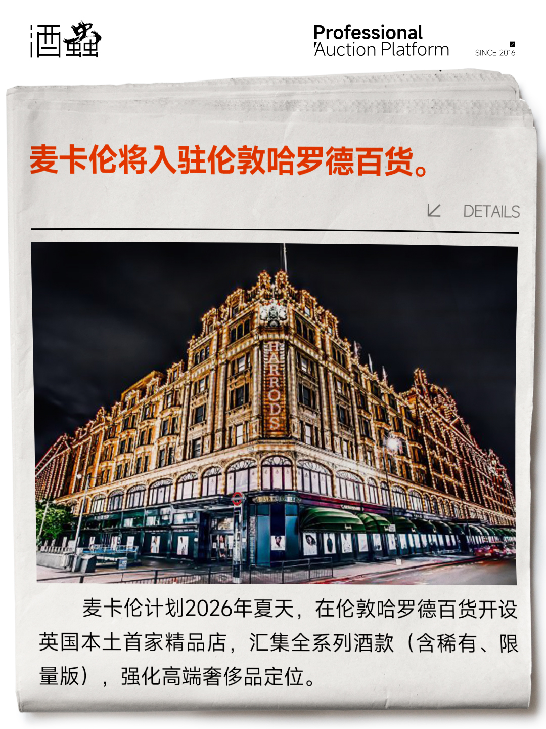 麦卡伦计划2026年夏天,在伦敦哈罗德百货开设英国本土首家精品店,汇集全系列酒款(含稀有、限量版),强化高端奢侈品定位。