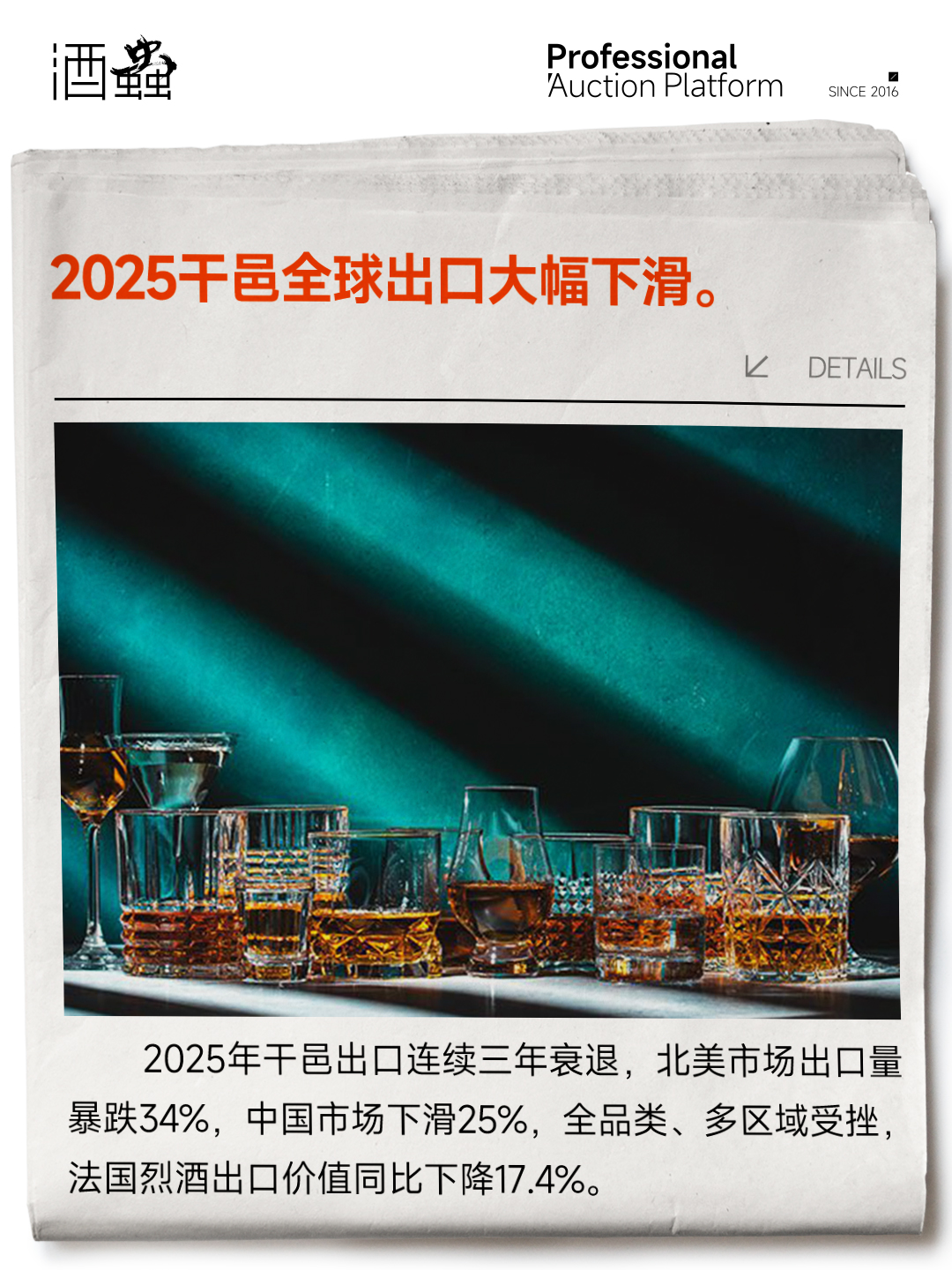 2025年干邑出口连续三年衰退,北美市场出口量暴跌34%,中国市场下滑25%,全品类、多区域受挫,法国烈酒出口价值同比下降17.4%。