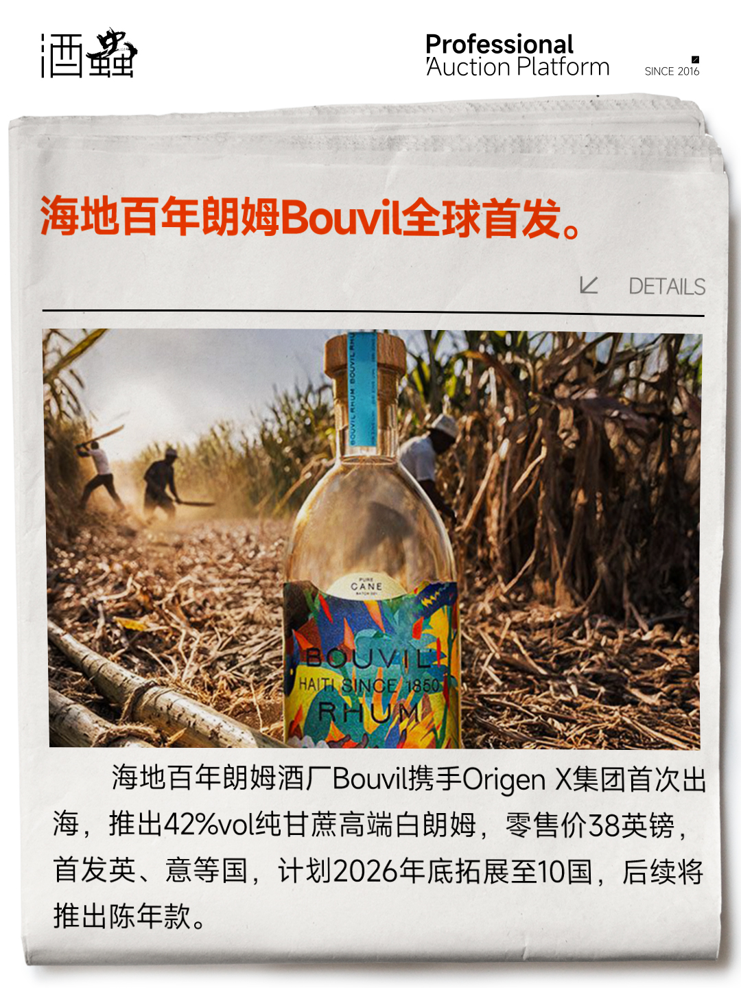 海地百年朗姆酒厂Bouvil携手Origen X集团首次出海,推出42%vol纯甘蔗高端白朗姆,零售价38英镑,首发英、意等国,计划2026年底拓展至10国,后续将推出陈年款。